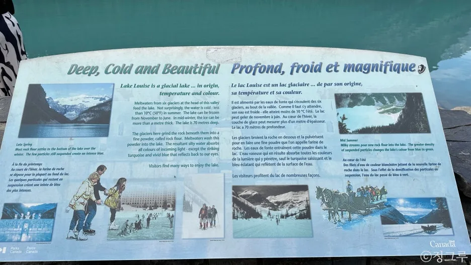 호수의 아름다운 빛깔은 이 물이 빙하이며, 빙하 물이 돌을 미세하게 간 입자와 함께 있어서 빛이 아름다운 빛만 반사하고 나머지는 다 먹는 것 같다. 겨울에는 돌 입자들이 바닥으로 가라앉으니, 얼음이 막 녹을 즘 레이크 루이스에 오면 좌측 상단 사진처럼 색다르게 푸른 레이크 루이스를 볼 수 있다 한다. 깊은 곳은 70미터까지도 된다고 하니 가늠이 안 된다.
