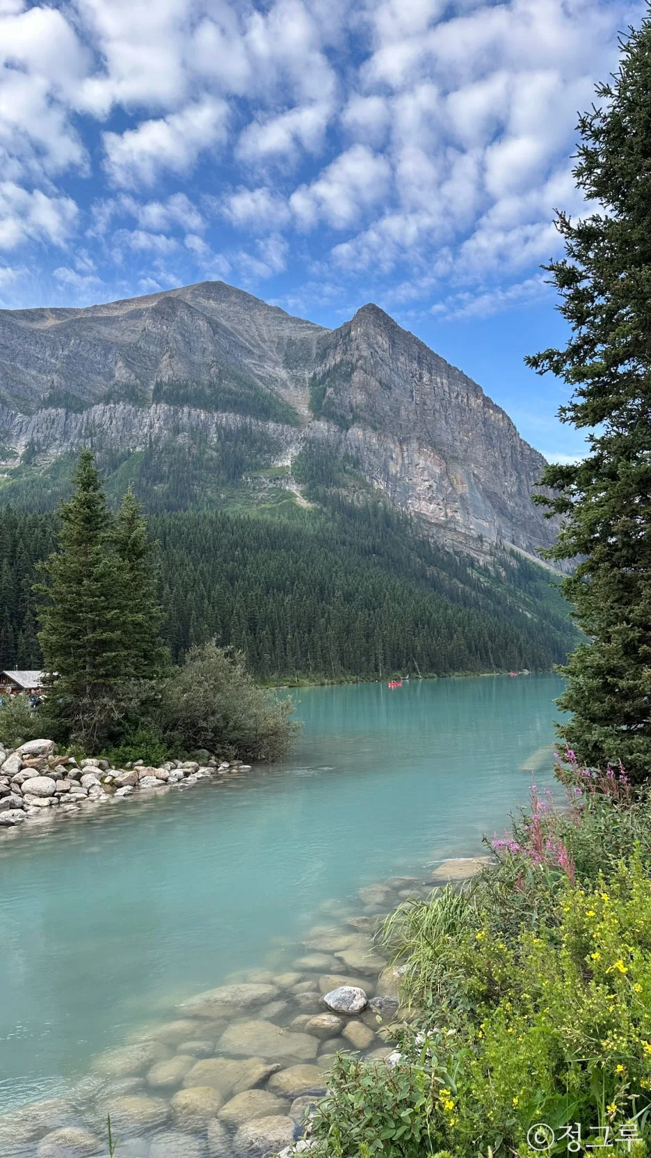 꿈같은 한 시간을 금세 보내고 카누를 반납하고 나오는 길. 햇빛 덕에 색깔이 많이 밝아지고 예뻐진 레이크 루이스다. 보트하우스에서 나오면서 대충 찍은 사진이 의외로 예쁘게 나왔네.