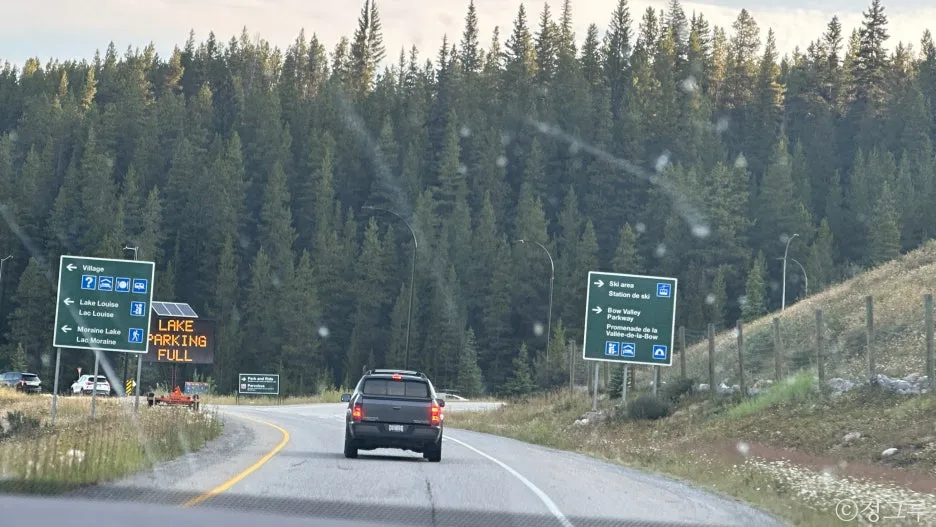 루이스 레이크 옆에 있는 아주 작은 주차장은 벌써부터 만석이라고 노란 전광판으로 안내하고 있었다.