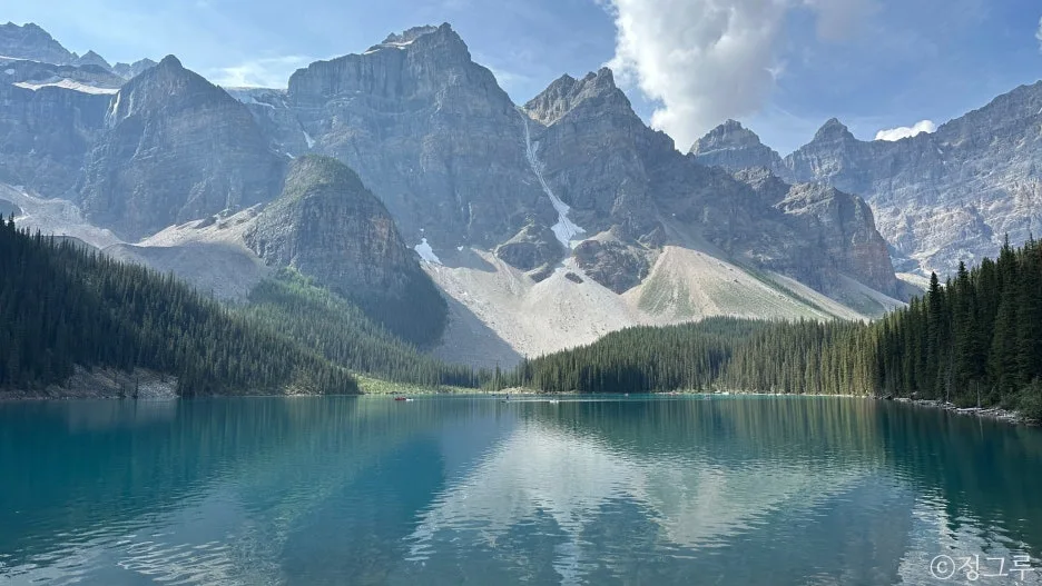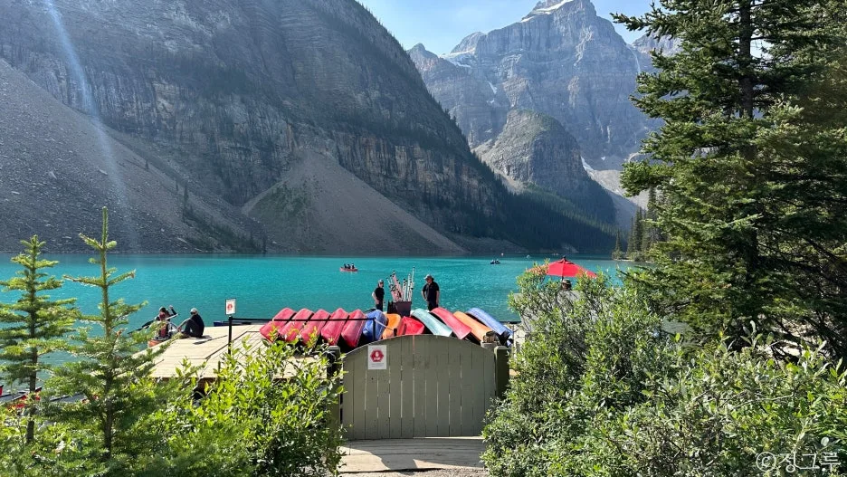 예약에 성공한 자만 올 수 있는 호수이다 보니 + 그 빛깔이 워낙 예쁘다 보니 + 워낙 유명하고 인기가 많은 곳이다 보니 레이크 루이스와 모레인 보트 대여하는 값이 참 비싸다.