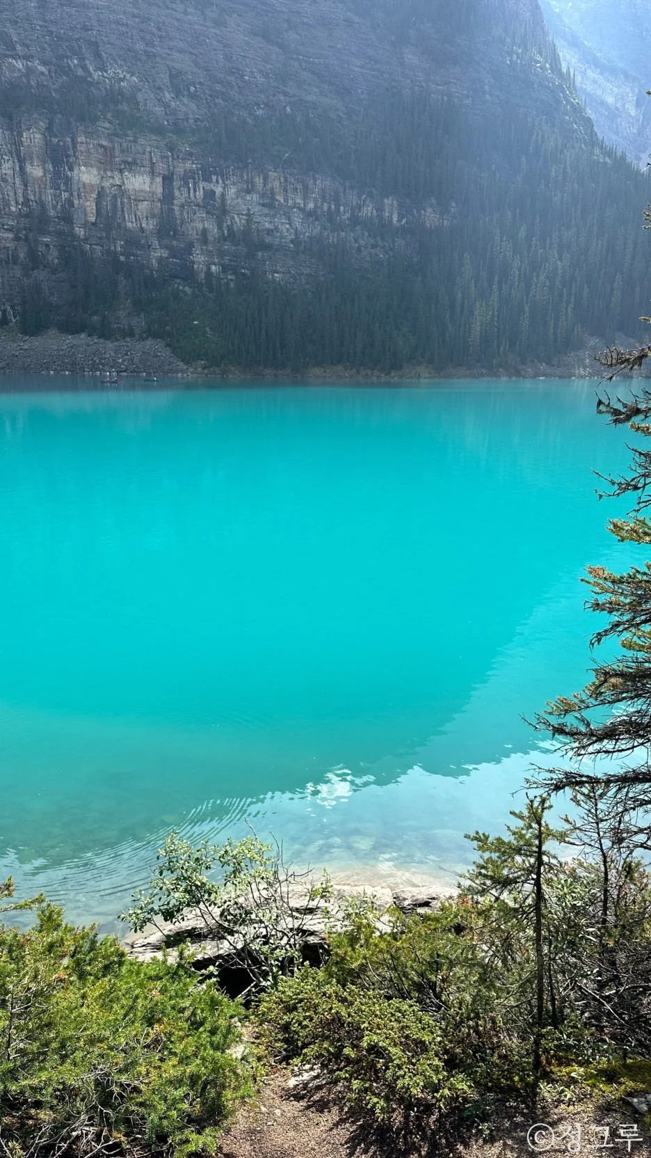 지금까지 호수를 여덟 군데 넘게 봤지만 이 물빛은 또 처음 본다. 그동안은 아예 내가 아는 평범한(?) 물색이거나 우유를 탄듯한 에메랄드 빛의 강이 많았는데 이곳은 조금 더 청록빛. 파랑에 가까운 색이었다.