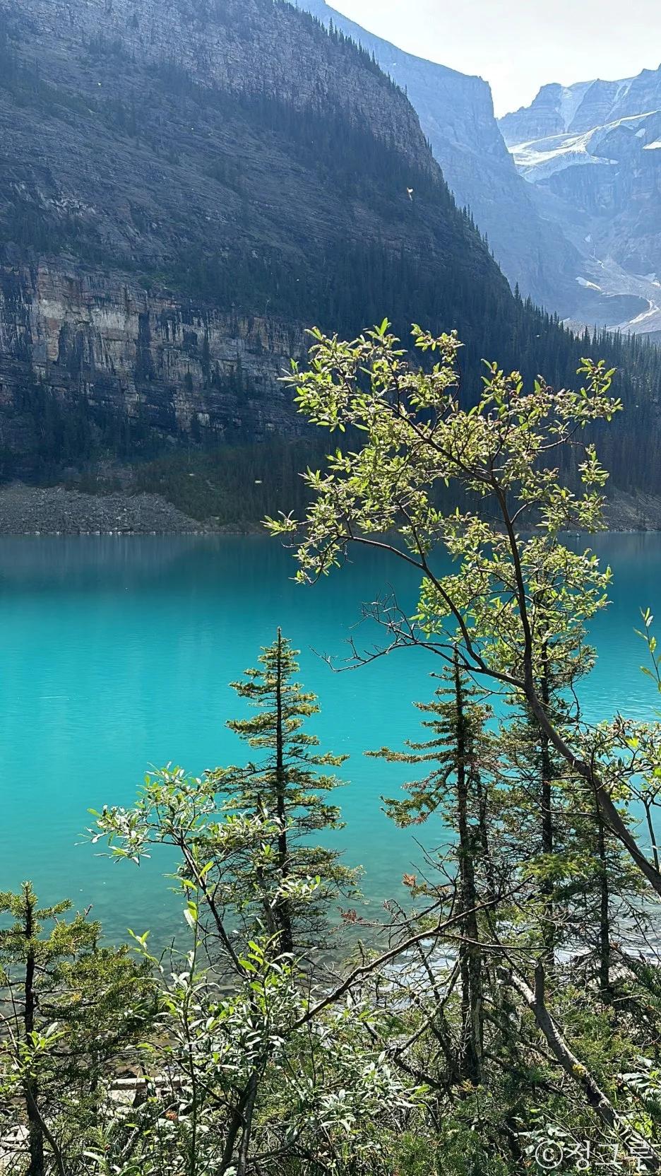햇빛이 적은 레이크루이스를 볼 때와 마찬가지로 더 평온하고 깊은 느낌을 준다.