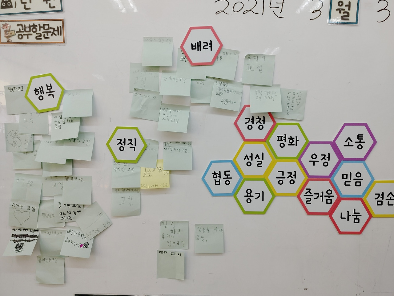아이들과 나는 그림책을 통해 배운 덕목을 활용하여 '내가 바라는 우리 반'을 적어 내었다. 그래서 탄생하게 된 우리 반의 이름은, '행복하고 배려하는 정직한 2학년 *반'이 되었다.