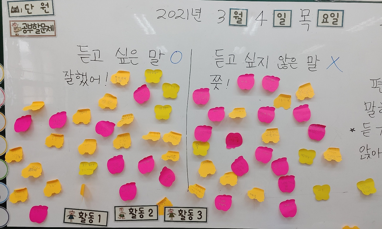 오늘은 아이들과 평소에 듣고 싶은 말과 듣기 싫은 말을 나누며 '나 전달법' 의사소통 말하기를 연습했다.