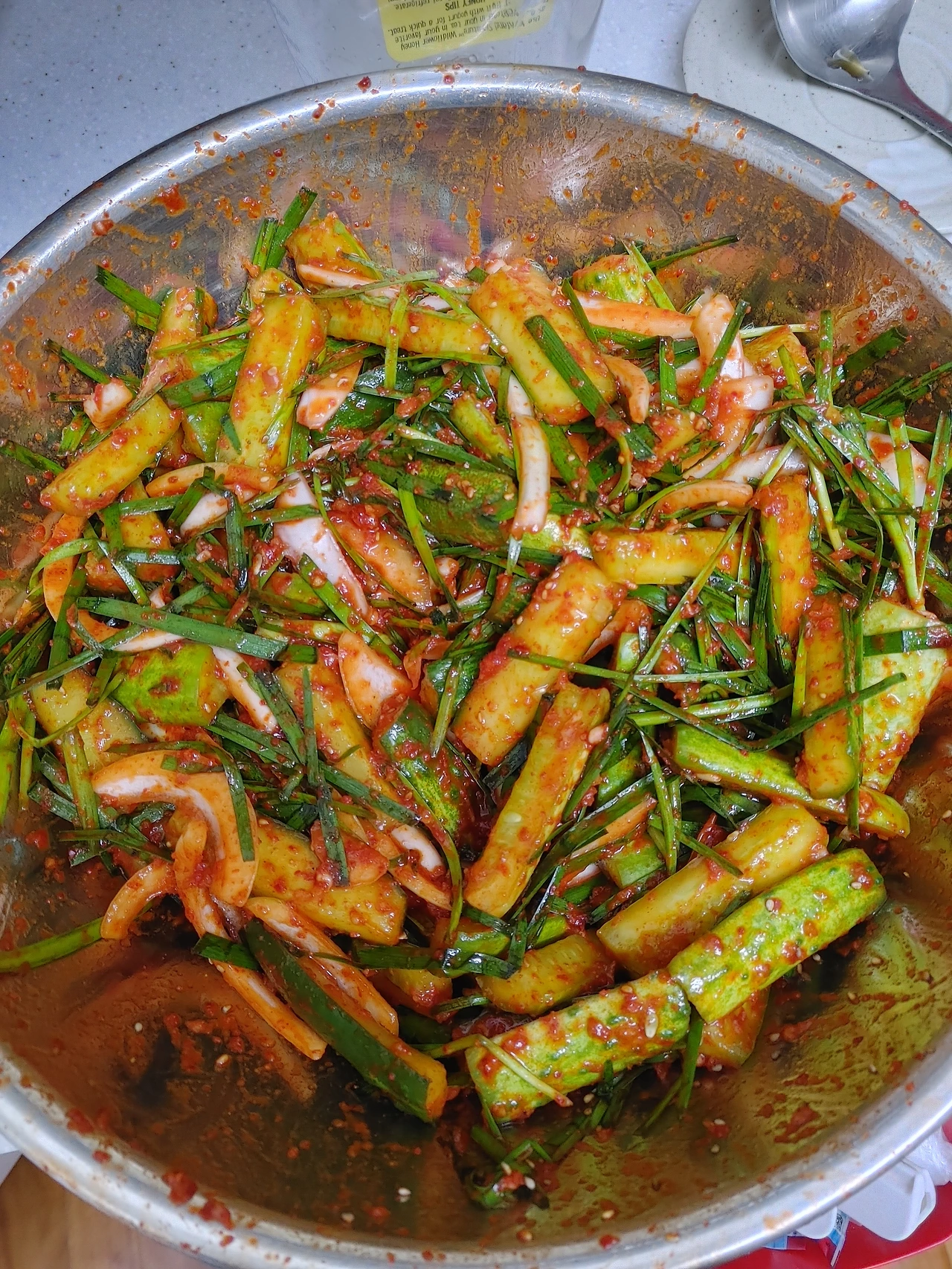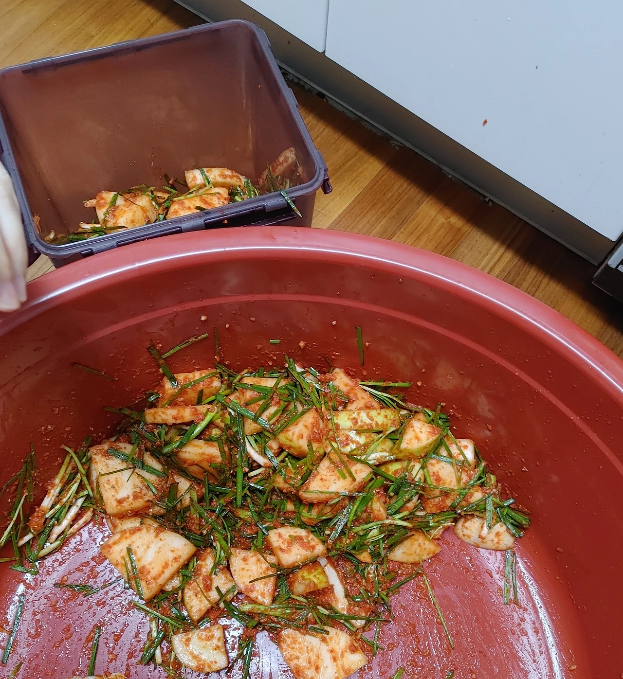 남편은 무와 오이, 부추, 파를 씻고 내가 주문하는 크기대로 잘랐다. 난 끓인 소금과 뉴스가 물에 오이를, 소금에 무를 절이고 김치 양념을 만들었다. 김치 양념에 들어갈 양파와 배 손질도 남편의 몫이었다. 남편은 이날 담근 김치의 7할이 자기 몫이라 주장한다. 그렇지만 김치는 양념이 7할 이상이다. 아무리 재료를 빠르게, 예쁘게 자르면 뭐 하나, 양념이 맛없으면 꽝인 거다. 재료를 씻고 다듬는 역할을 메인 요리사가 맡지 않는 데는 다 이유가 있다.
