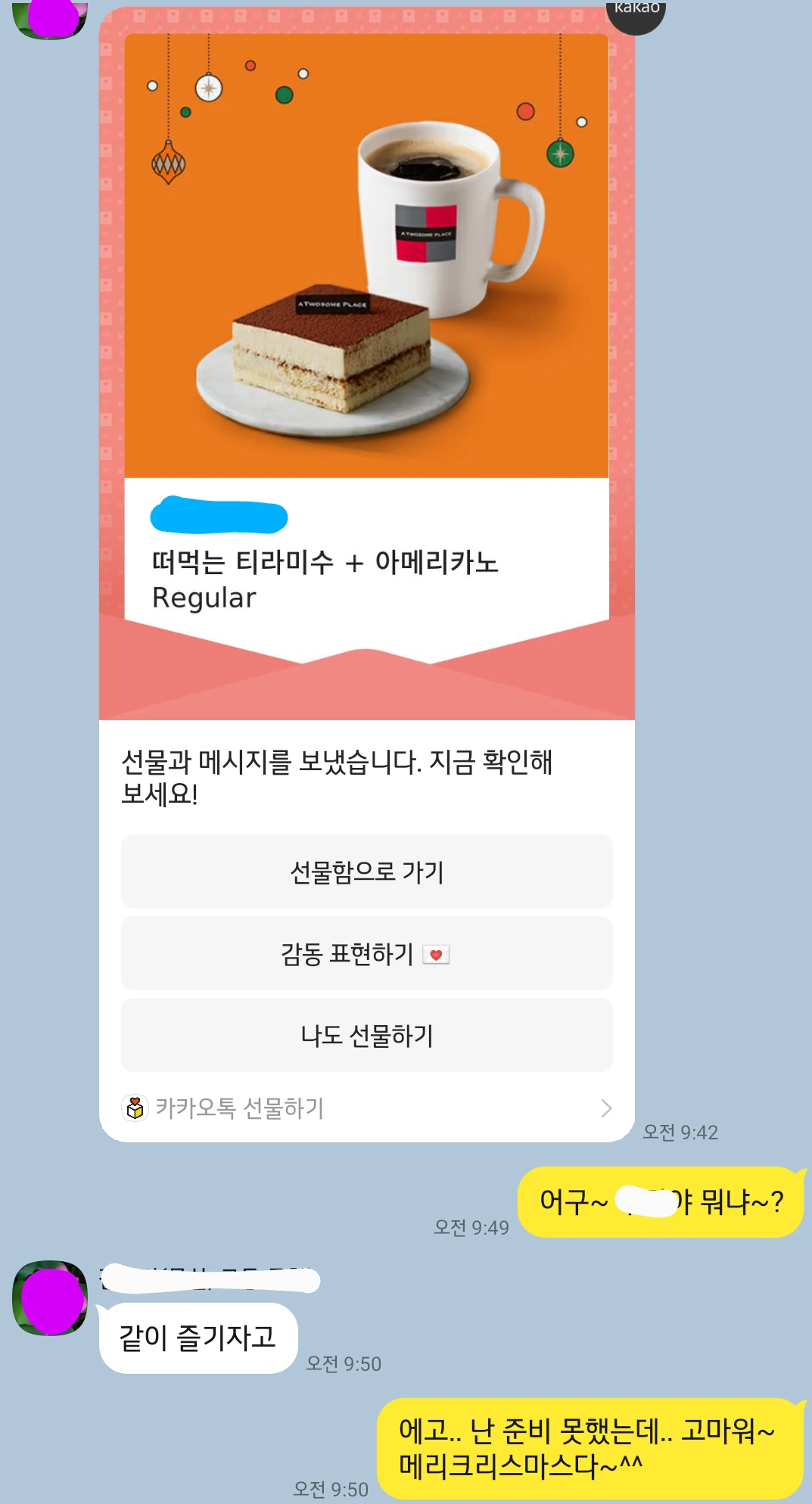 크리스마스날 늦잠 자고 일어나 무엇을 먹어야 할지 고민하던 중 날아온 친구의 톡 선물도 감동이었다. 좋은 날, 좋은 마음을 나누고 싶은 친구는 늘 나를 마음 부자로 만든다. 올해 난 누군가를 마음 부자로 만들어 준 적이 있었던가.