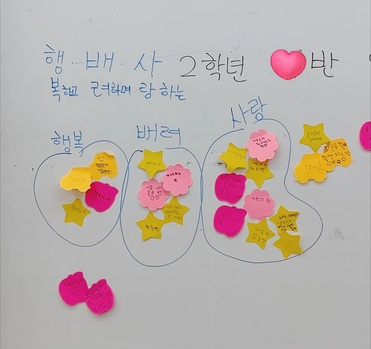 우리 반 이름 짓기 시간에 우리 반 아이들과 함께 지은 이름이다. '우리 반이 이런 반이 되었으면 좋겠다'는 아이들 각각의 생각을 모아보니 '행복, 배려, 사랑'의 요소들이 가장 많았다. 그래서 2022년 우리 반의 이름은 '행복하고 배려하며 사랑하는 2학년 0반'이 되었다.