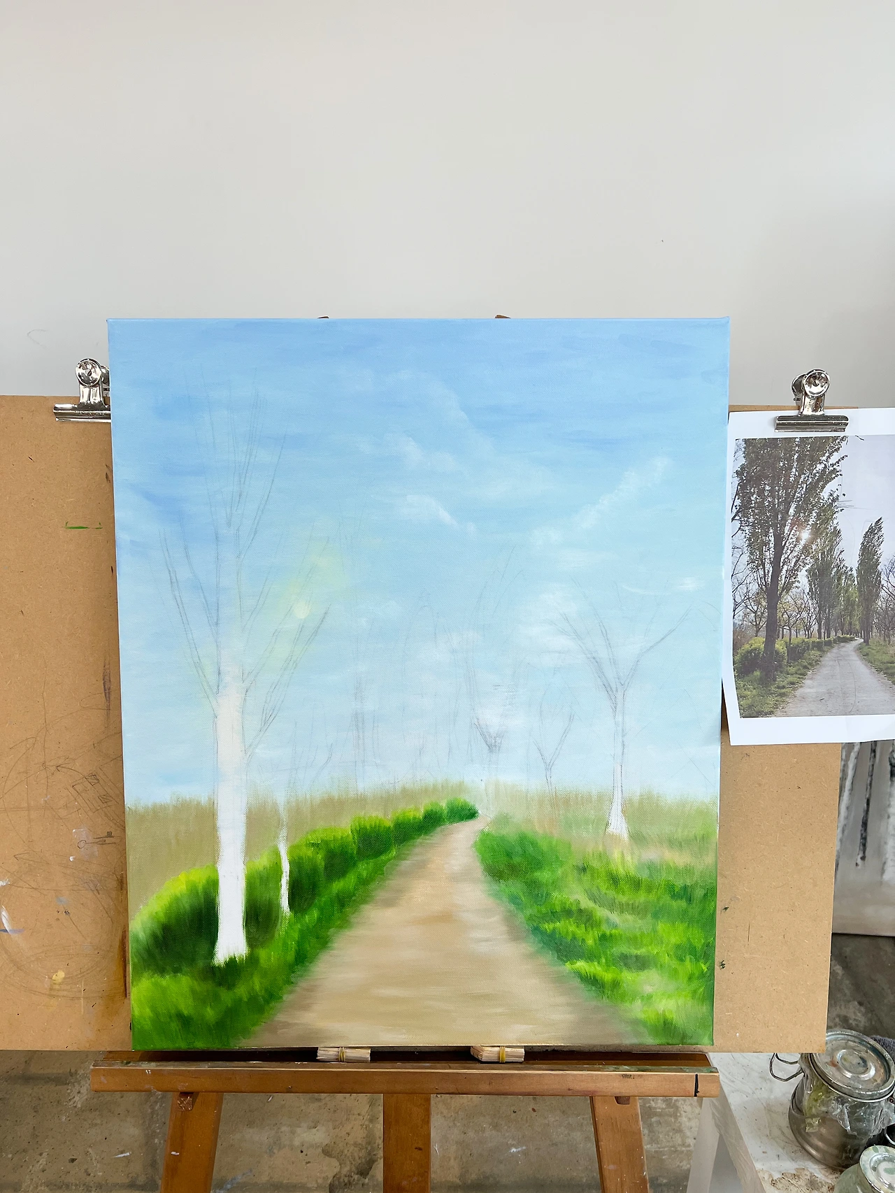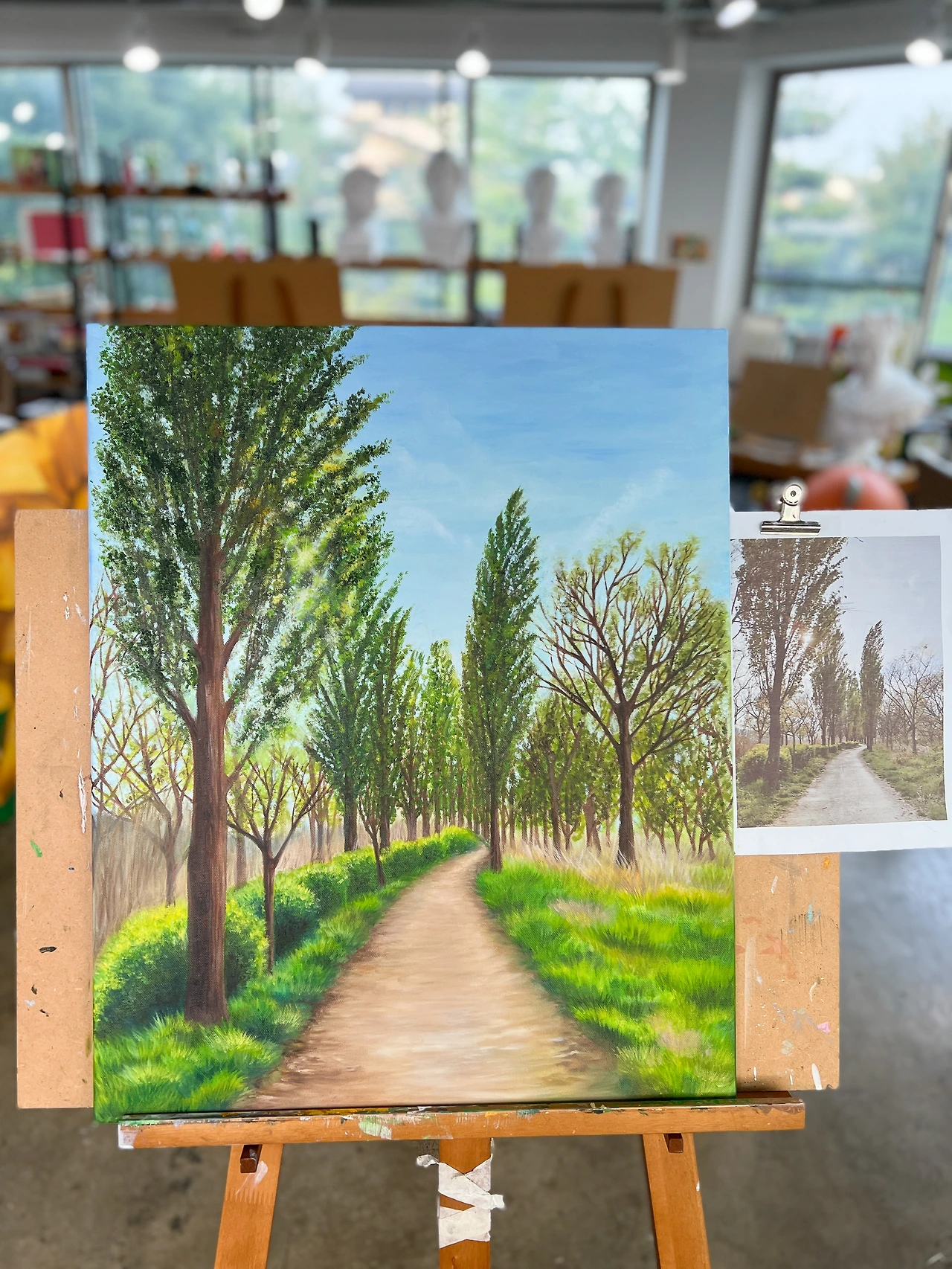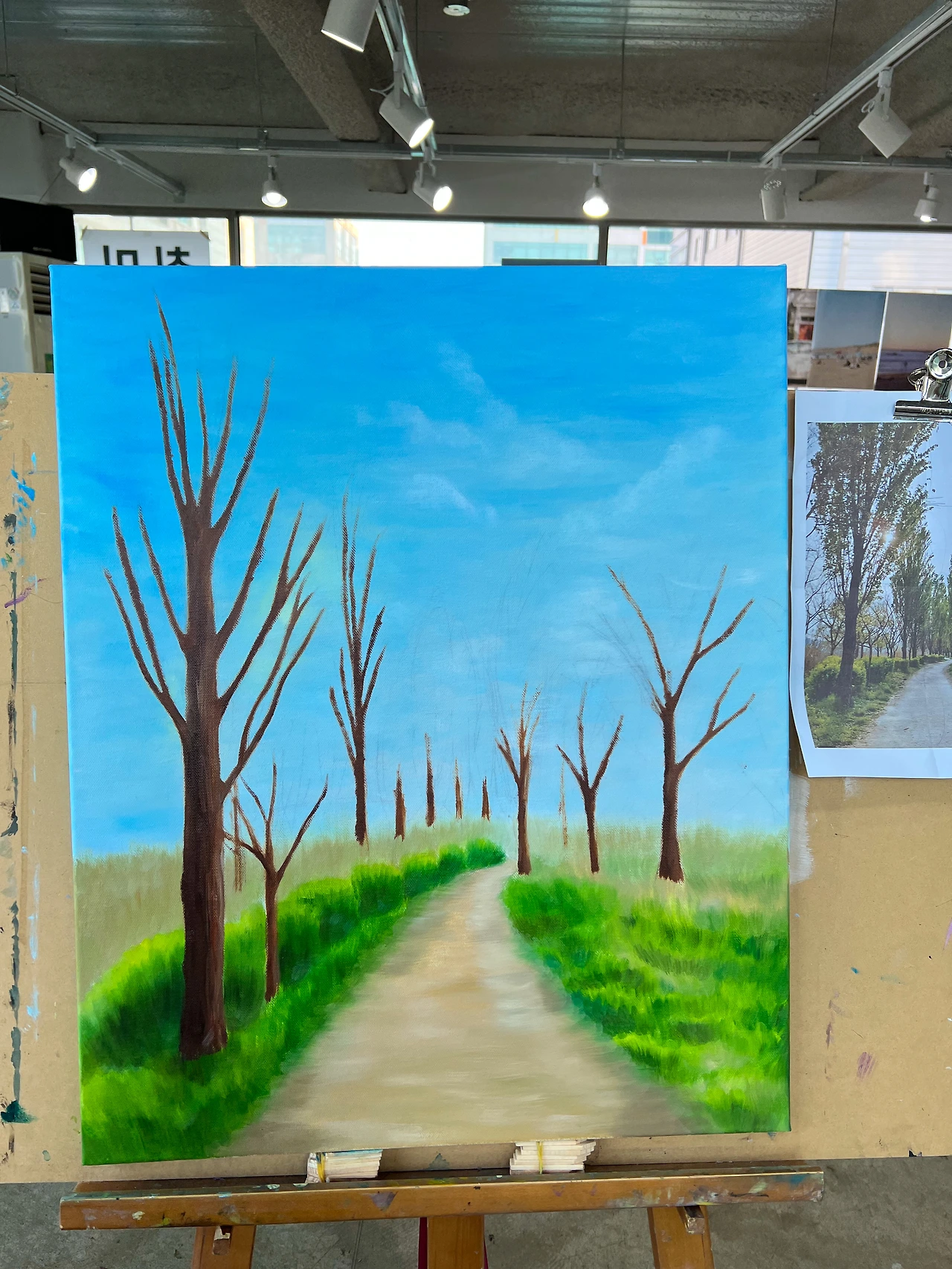 다만, 이전까지 없던 햇살이 그림에 등장하는 순간, 그림의 전개는 이전과는 다른 양상으로 펼쳐진다. 빛은 비치는 공간 전체에 영향력을 발휘한다. 그러므로 빛이 비치는 각에 맞춰 거의 다 된 줄 알았던 다른 부분들의 명도에 변화가 생긴다. 유화는 끊임없는 덧칠로 인한 소멸과 생성이 반복되는 과정. 과연 끝이 있기는 한 것일까. 원본 사진에서 느껴지는 바람의 방향과 멋대로 휘둘리지 않으려는 나무들의 굳은 결기까지 표현하고 싶었던 마음은 욕심이겠지.