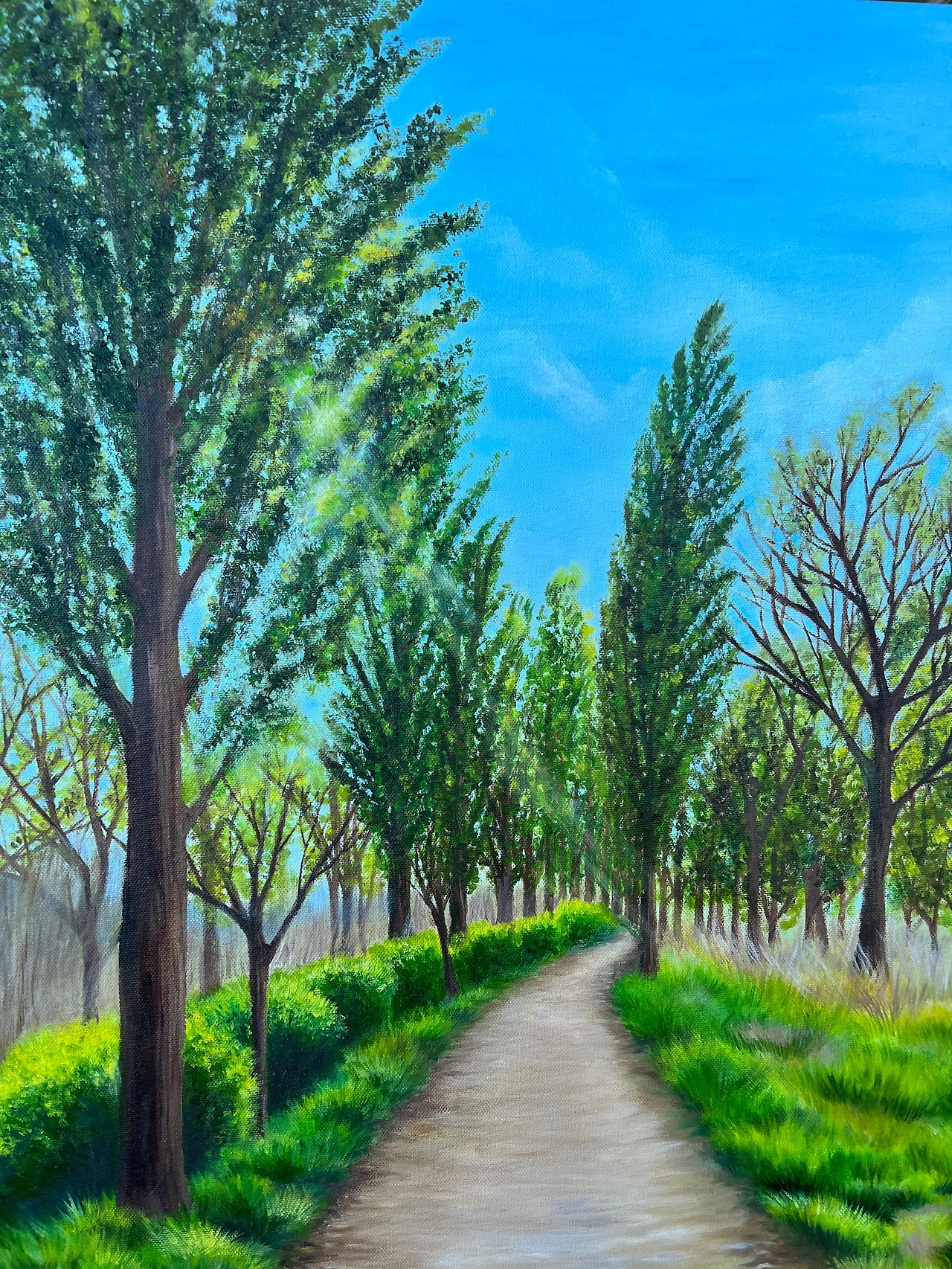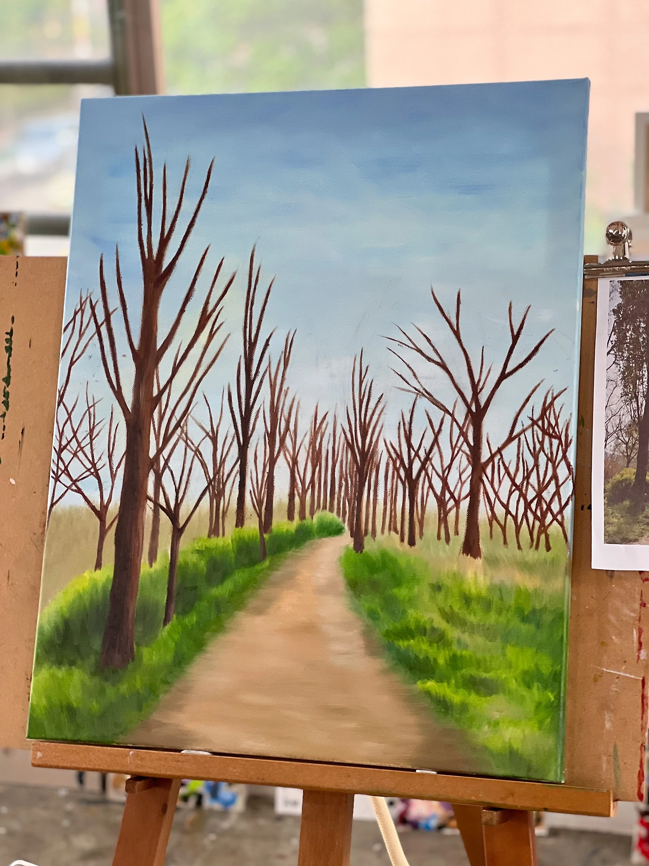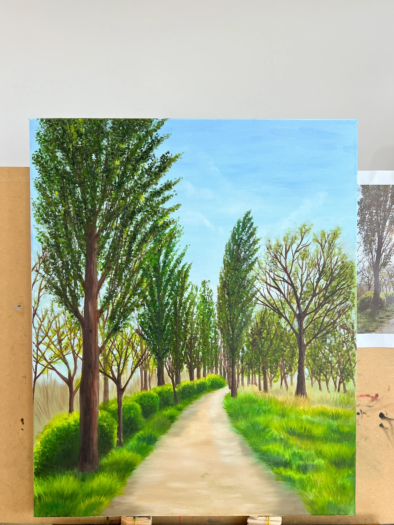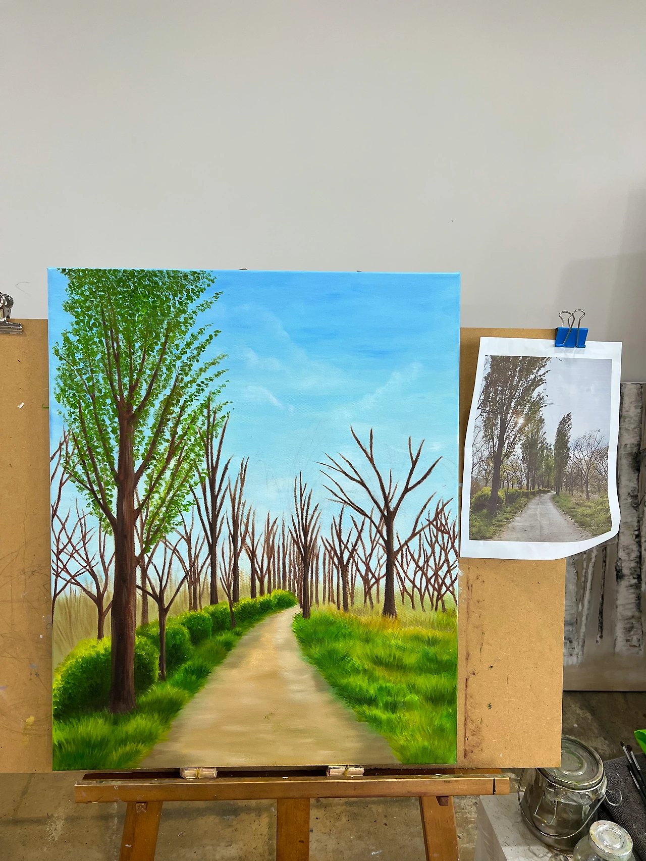 다만, 이전까지 없던 햇살이 그림에 등장하는 순간, 그림의 전개는 이전과는 다른 양상으로 펼쳐진다. 빛은 비치는 공간 전체에 영향력을 발휘한다. 그러므로 빛이 비치는 각에 맞춰 거의 다 된 줄 알았던 다른 부분들의 명도에 변화가 생긴다. 유화는 끊임없는 덧칠로 인한 소멸과 생성이 반복되는 과정. 과연 끝이 있기는 한 것일까. 원본 사진에서 느껴지는 바람의 방향과 멋대로 휘둘리지 않으려는 나무들의 굳은 결기까지 표현하고 싶었던 마음은 욕심이겠지.