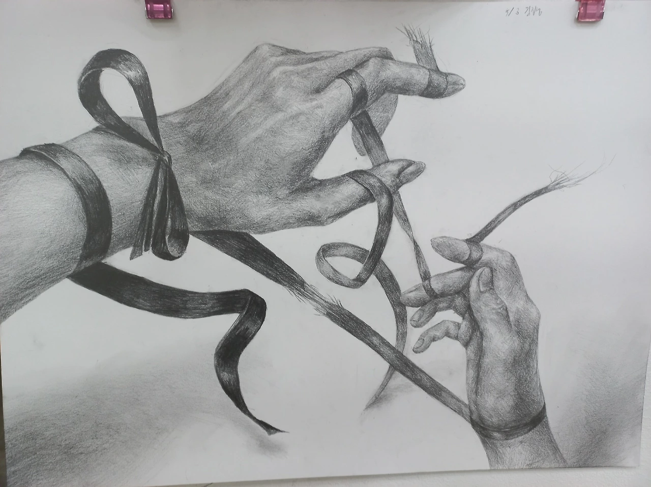 끊어지기 일보 직전의 리본 디테일이 불러일으키는 긴장감. 그러한 사실에 당황한 듯한 양손의 아련한 손놀림. 전문가가 아닌 내게도 아들의 소묘는 그런 분위기를 생생하게 전해 주었다. 얼마 전까지만 해도 첫날에 그린 손 그림 이상의 그림이 안 나온다는 선생님의 말에 풀이 죽었던 녀석이었다.