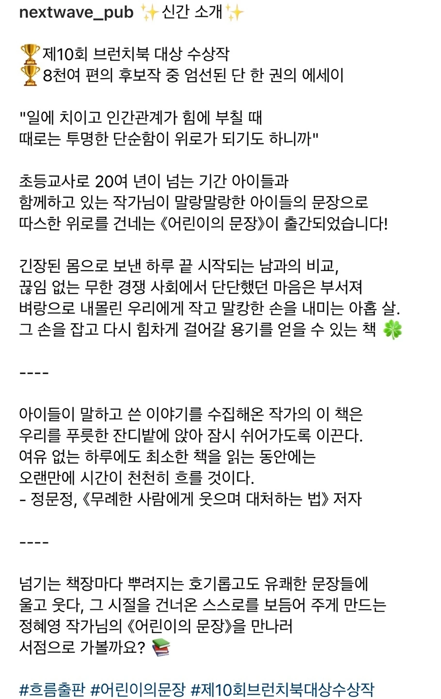 그럴 때가 있다. 아무도 타박하지 않고 지적하지 않았지만 스스로 위축되는 순간. 집으로 돌아가 간절히 혼자 있고 싶은 순간. 기억도 가물가물한 아홉 살을 지나 어느덧 사회인이 된 우리들은 힘껏 버티다 여지없이 무너지곤 한다. 낯선 환경에, 어려운 사람들의 틈바구니에서 꿋꿋이 버티는 어른들을 위해 제10회 브런치북 대상 수상작 『어린이의 문장』이 흐름출판에서 출간되었다.