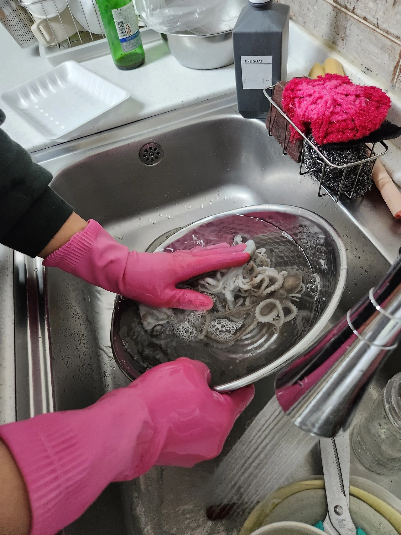 진저리를 치며 절대로 안 할 것 같던 남편도 결국 살아있는 낙지에 손 델 수 있는 사람이 아무도 없음에 KO패 당하고 말았다. 고무장갑은 갑갑해서 안 끼던 사람인데 도저히 맨손으로는 만질 엄두가 안 났는지 남편은 제일 먼저 고무장갑을 꼈다. 세발낙지를 한 마리씩 들어 올릴 때마다 요동치는 낙지의 움직임을 옆에서 지켜보던 나와 딸은 동시에 "꺅! 꺅!"을 연발했다.