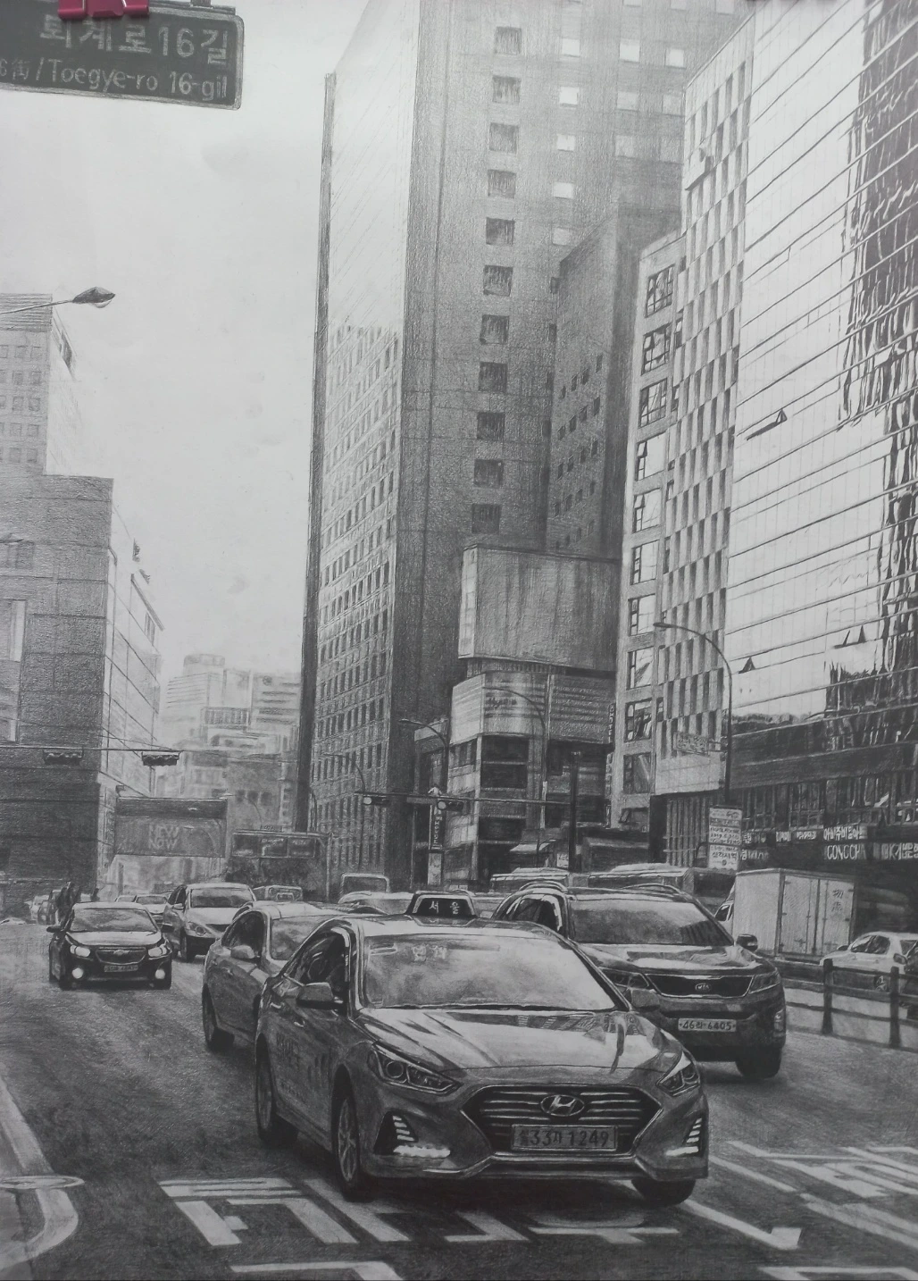 아들은 다양한 자동차들의 앞모습, 뒷모습, 옆모습을 그리다 성에 안 차 입체로도 그리며 자동차 사랑을 이어갔다. 성장함에 따라 종이 접기와 블록 맞추기로 선호하는 표현 방식은 달라졌어도 대상화 목록에 자동차는 늘 1순위였다. 그러니 17살이 되어 처음으로 참가한 전국대회에서 상을 받은 작품이 '자동차의 행렬'을 표현한 소묘라는 게 단순한 우연이고 행운일까.
