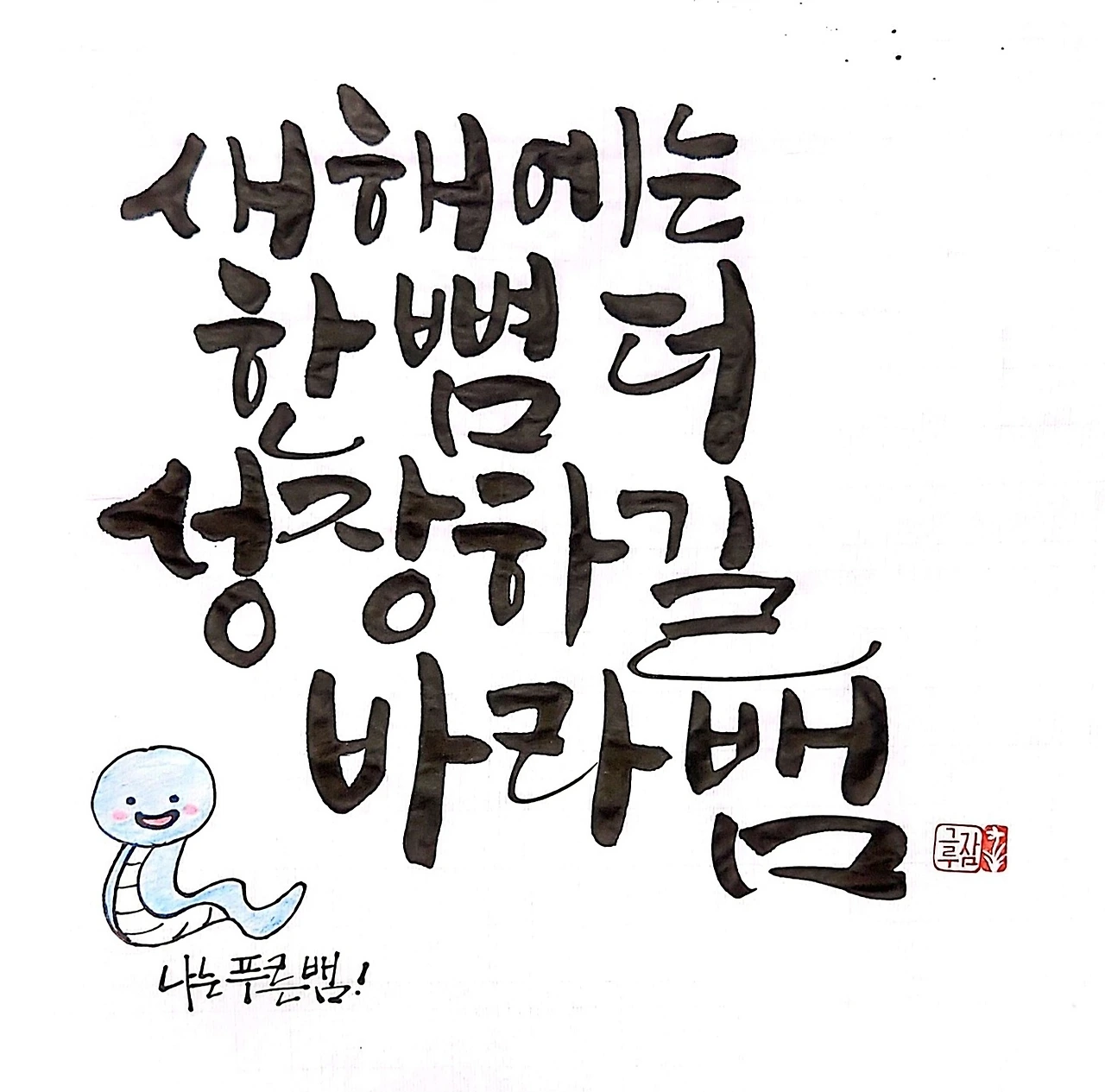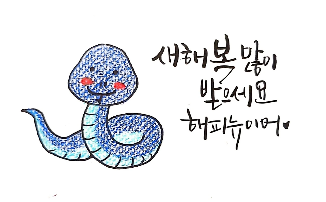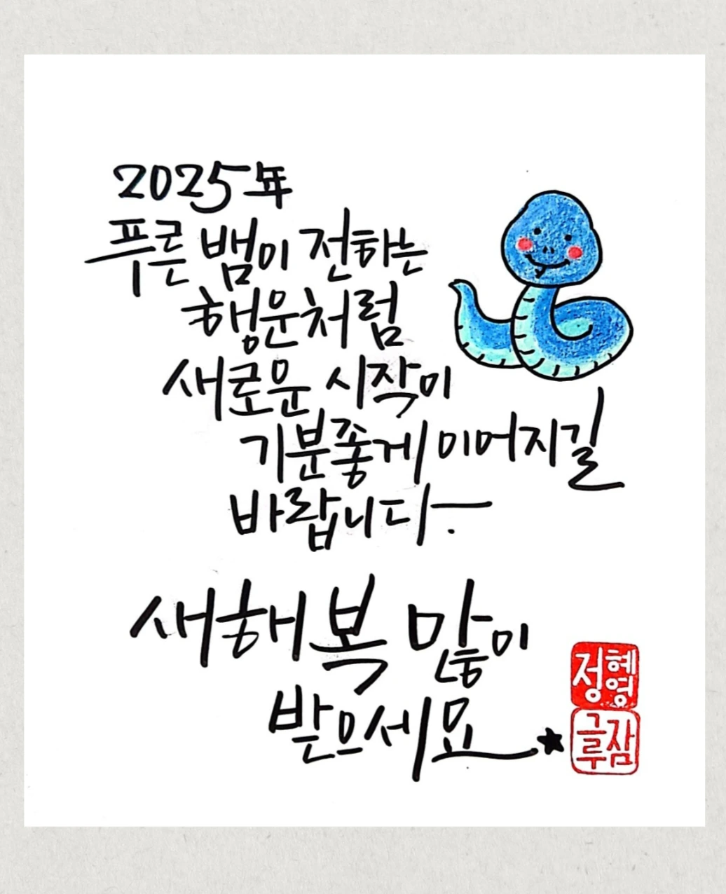 새해 전후로 온라인 캘리 톡방에 올라온 회원들의 새해 인사 캘리들을 훑어보았다. 회원들 중 현직 미술 선생님이신 선홍님께서 '을사년 청뱀'의 해를 맞아 몇 가지 귀여운 뱀 일러스트를 올려 주셔서 간단한 버전을 활용하기로 했다.