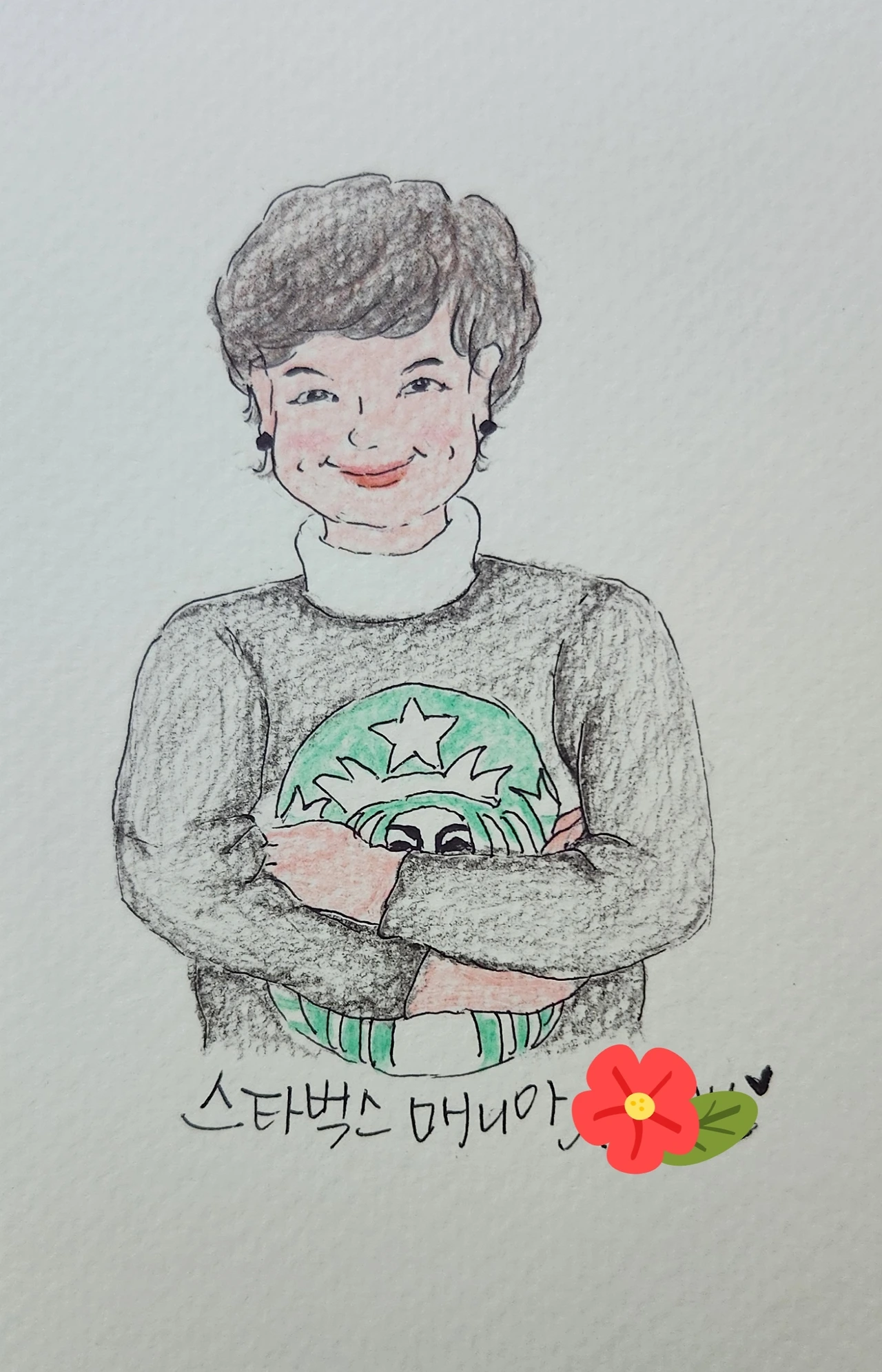 그녀가 올린 사진을 보고 연필로 스케치하고 펜으로 라인을 따라 그린 후 색연필로 색을 입혔다. '스벅 마니아'라고 소개하신 적이 있어서 그녀가 입고 있던 상의에 그려진 그림 대신 스벅 로고를 그려 넣었다. 사랑하는 스벅 로고를 가슴에 품고 신비로운 미소를 띠고 있는 동안의 중년 여인. 다 그리고 나니 12시가 가까워져 있었다. 캘리 단톡방에 그림을 올리며 얕은 숨을 내쉬었다. 그녀가 보면 뭐라고 할지 약간 긴장이 되었다.