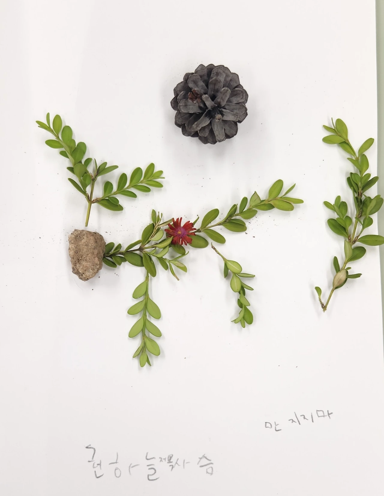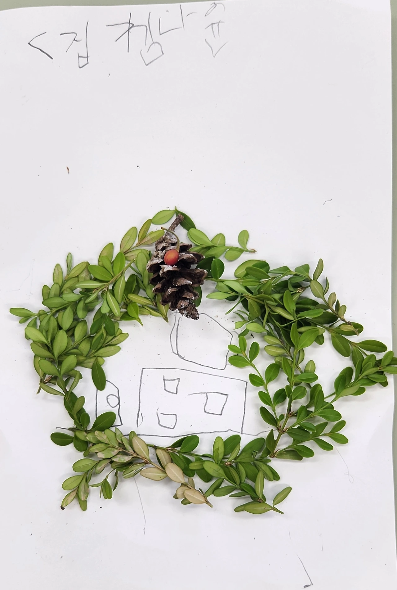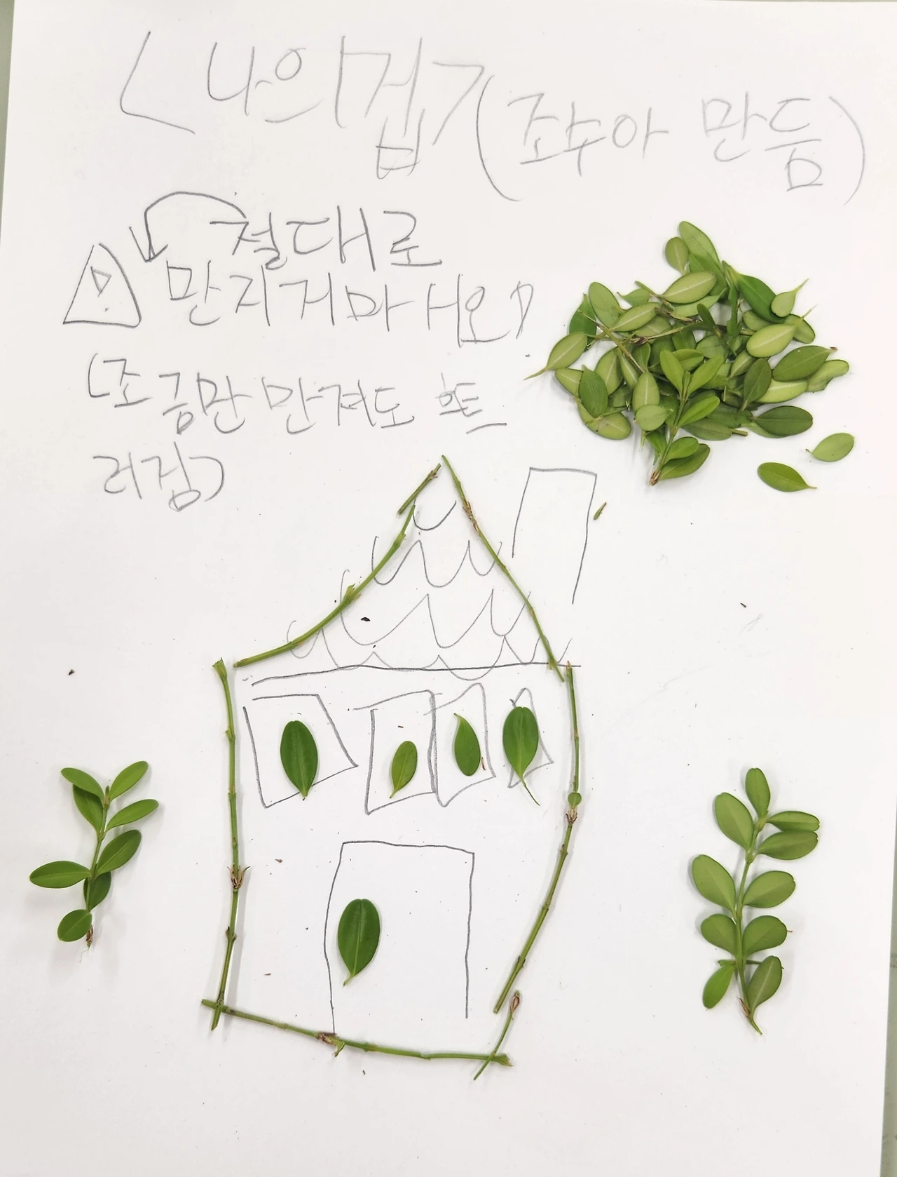 아이들 표정에는 사라진 것처럼 보였던 안타깝고 서운했던, 그럼에도 놓치지 않는 배움의 마음들이 고스란히 아이들 글 속에 남았다. 자신도 모르는 깊은 마음속 응어리까지 글로 뱉어냈으니 이제 평화가 깃들기를 바라며 몇 아이들의 글을 소개한다. 과정을 아는 이의 눈엔 한없이 귀해 보이는 아이들의 자연물 작품도.
