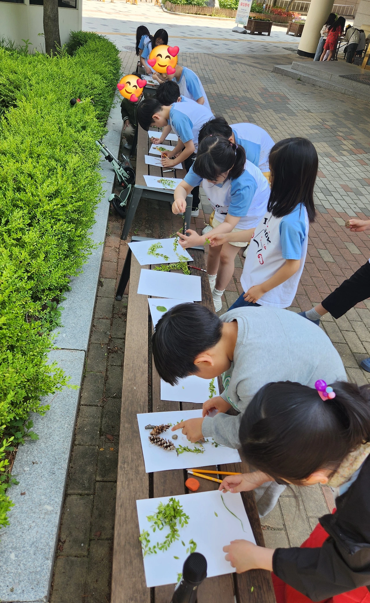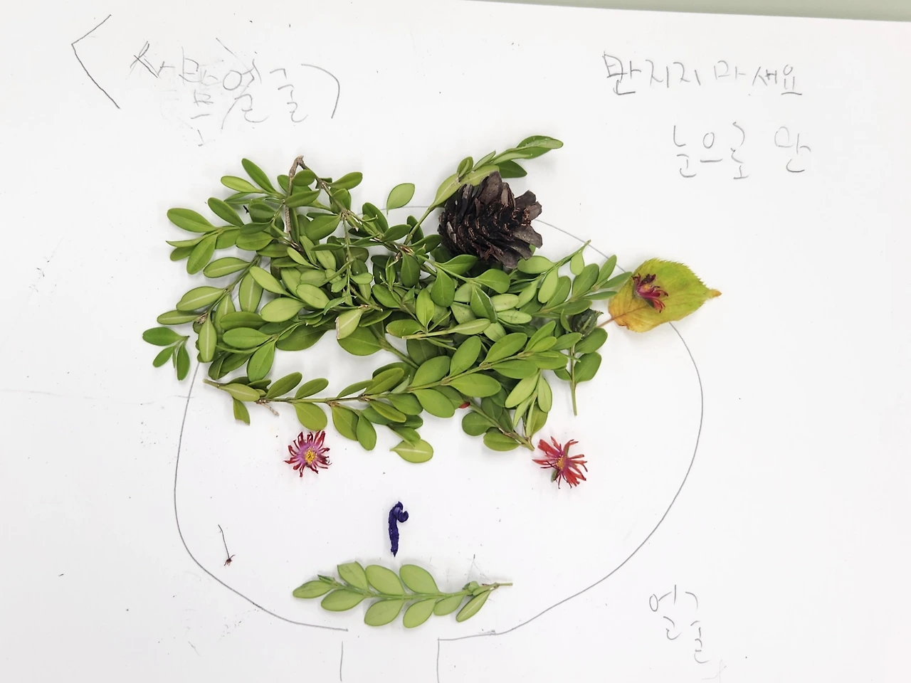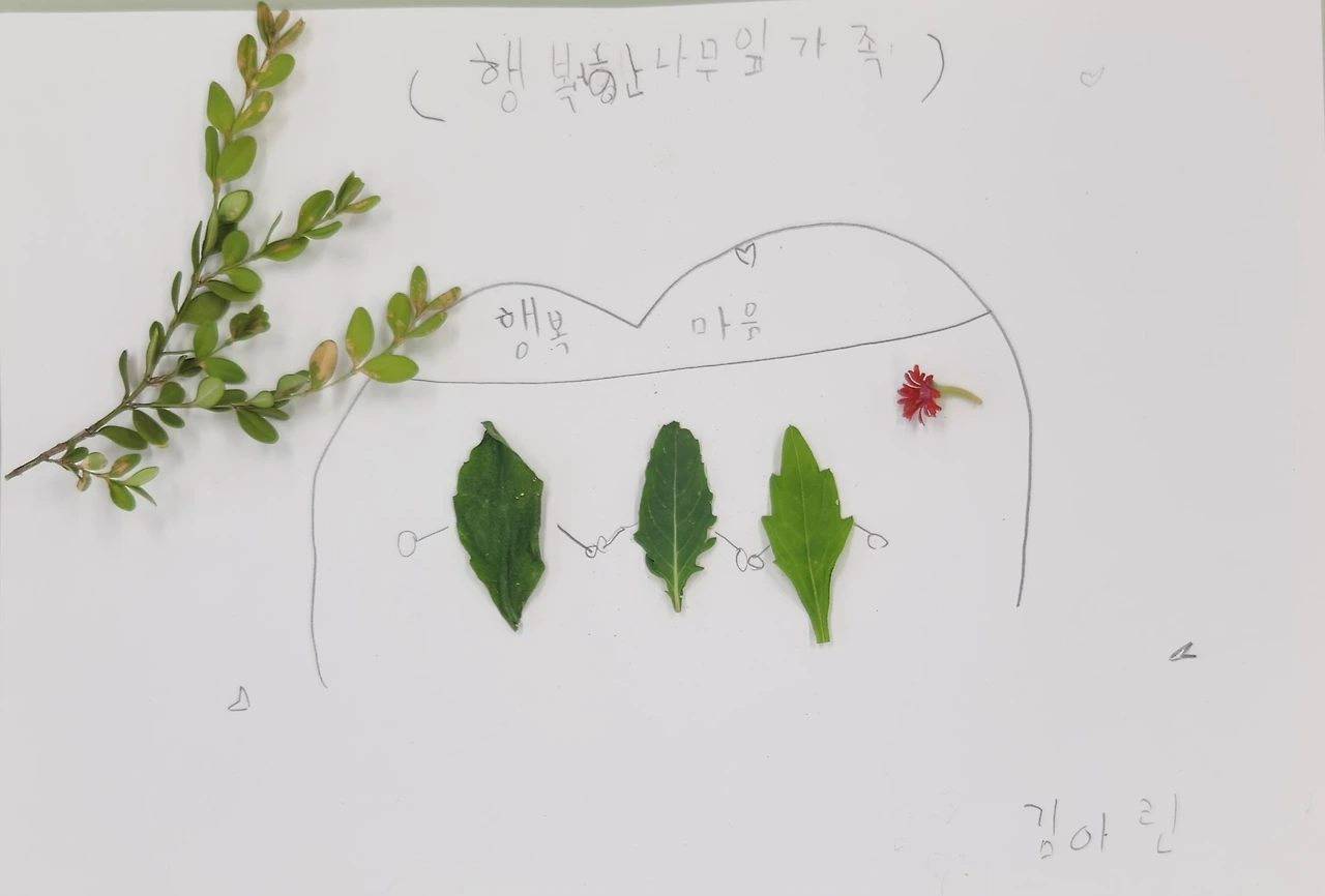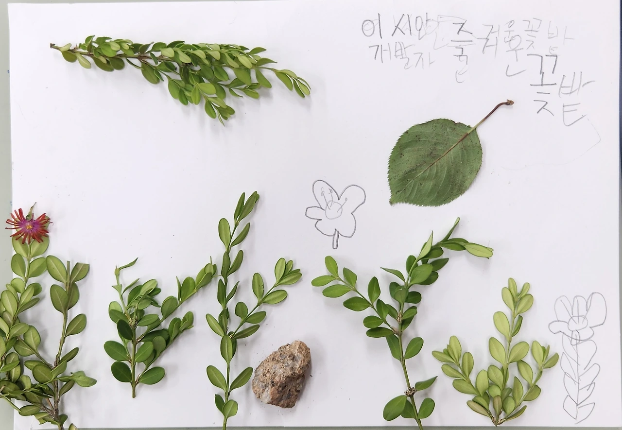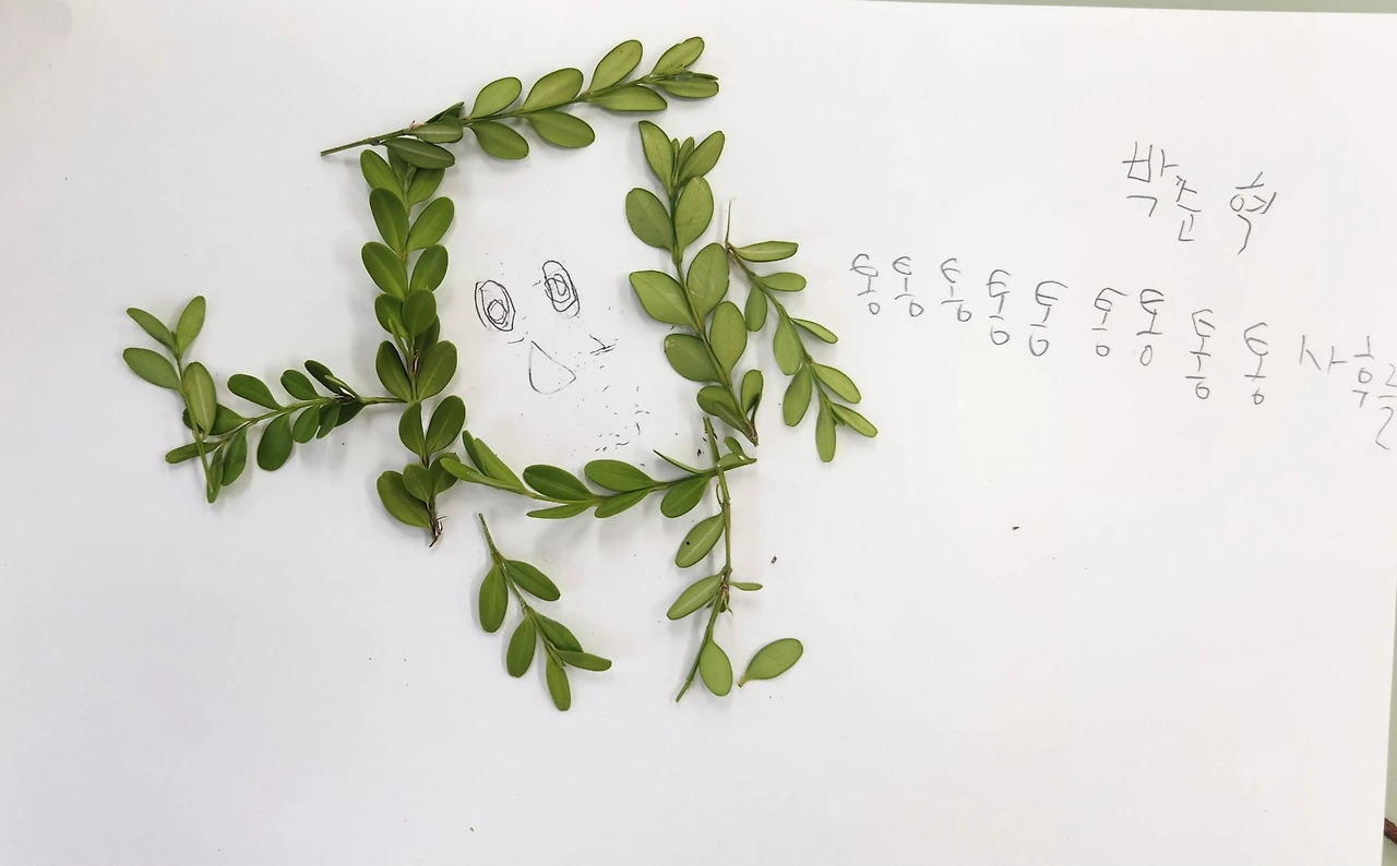 우리 반 아이들과 자연물을 활용한 만들기 수업을 하던 중이었다. 아이들은 화단 주변에서 주운 낙엽이나 열매를 재료로 만들고 싶은 것들을 종이 위에 자유롭게 표현하고 있었다. 마침 바깥일을 담당하시는 주무관님께서 예초기로 화단을 벌초하고 계셨다. 항상 말끔했던 화단 주변 여기저기에 예초기에 베인 잡초들과 나뭇잎들이 널려 있었다. 활동 수업 전, 생명 존중 교육을 병행하며 절대 일부러 따서는 안 된다고 당부했지만, 떨어진 잎이 궁하면 어쩌나 걱정했는데 덕분에 수업 재료가 풍성했다.