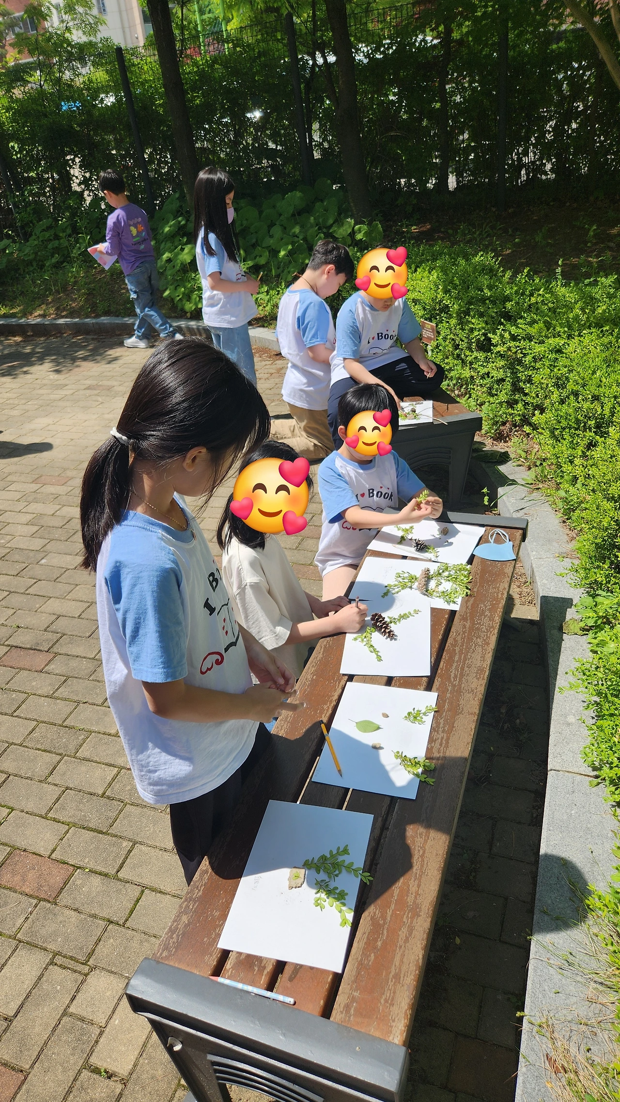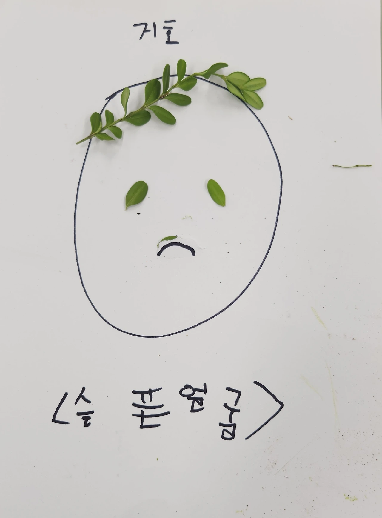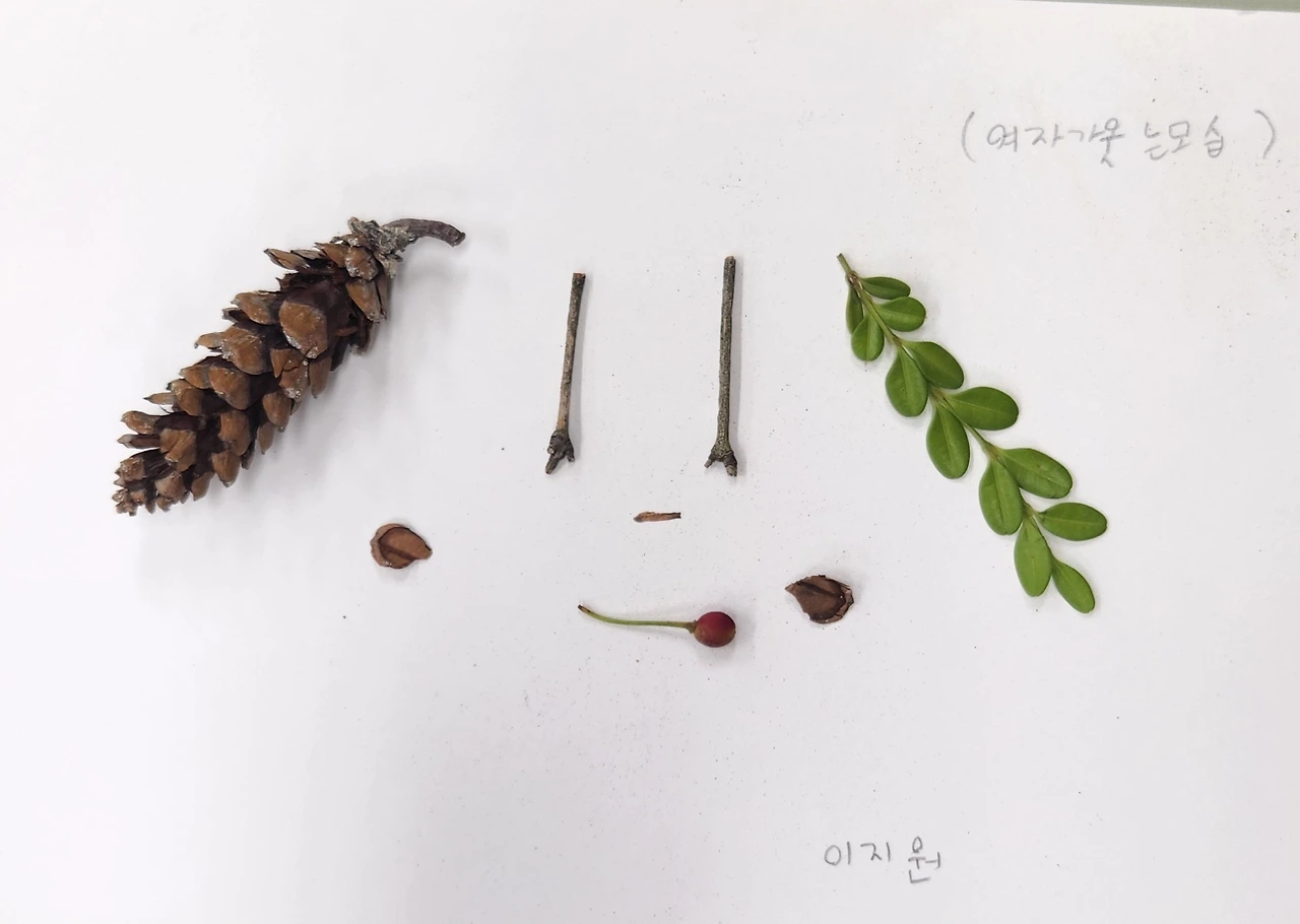 나는 오늘 자연물로 얼굴을 만들었다. 발표와 전시가 끝나고 그 자연물을 봉투에 담아야 했다. 나는 그게 아까워서 선생님한테 찍어달라고 했다. 열매는 힘들게 찾아서 가져가려고 했는데 깜빡했다. 아쉽다.