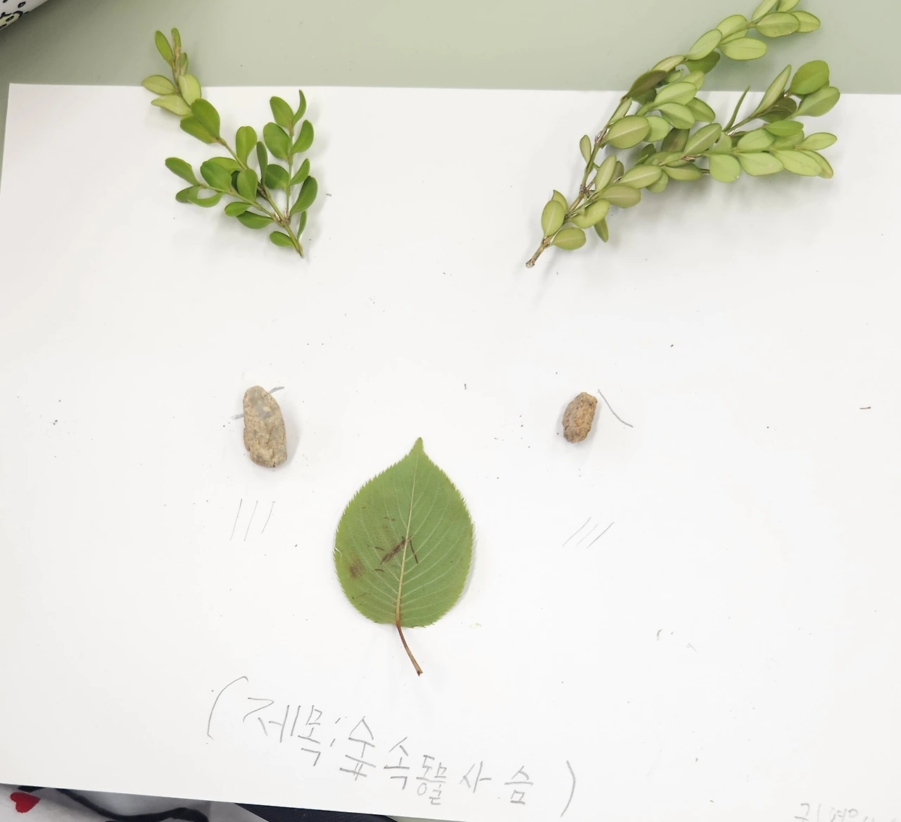나는 오늘 자연물로 만들기를 했다. 나는 돌멩이로 사슴을 만들었다. 근데 작은 돌멩이 찾는 게 너무 어려웠다. 찾고 찾아도 못 찾았다. 근데! 돌멩이가 벤치 밑에 있었다. 난 이렇게 말했다. "뭐야!!! 내가 그렇게 힘들게 찾았는데 제일 가까운 데 있었잖아!" 아휴, 너무 힘들게 찾긴 했지만 찾았으니까 다행이네.