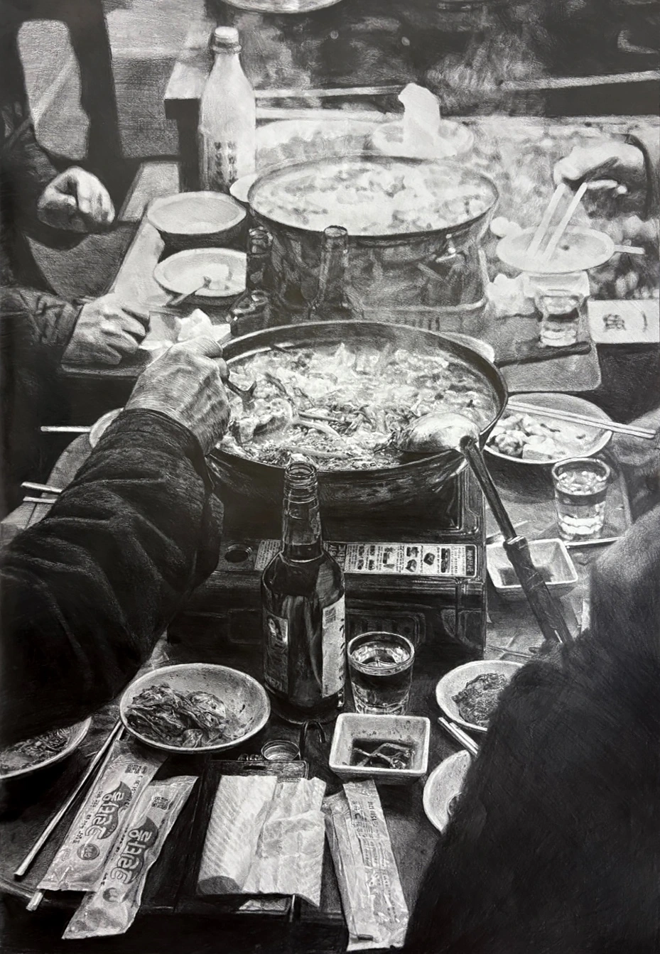 아들의 연필그림에선 고단한 하루를 보낸 이들이 한자리에 모여 김치 반찬 하나와 찌개, 소주 한 잔으로 잠시나마 시름을 녹이고 있었다. 찌개는 모락모락 끓고 있었고 색깔이 없는데도 김치의 붉은빛이 느껴졌다. 허기짐의 순간에도 손을 닦고 내던진 누군가의 물티슈가 널브러져 있었고 그조차 허락되지 않은 누군가의 물티슈는 뜯기지도 않은 채 놓여 있었다. 숟가락으로 국물을 뜨는 거칠고 투박한 손 위에 이 그림의 모든 순간을 터치했을 아들의 손놀림이 겹쳐졌다.