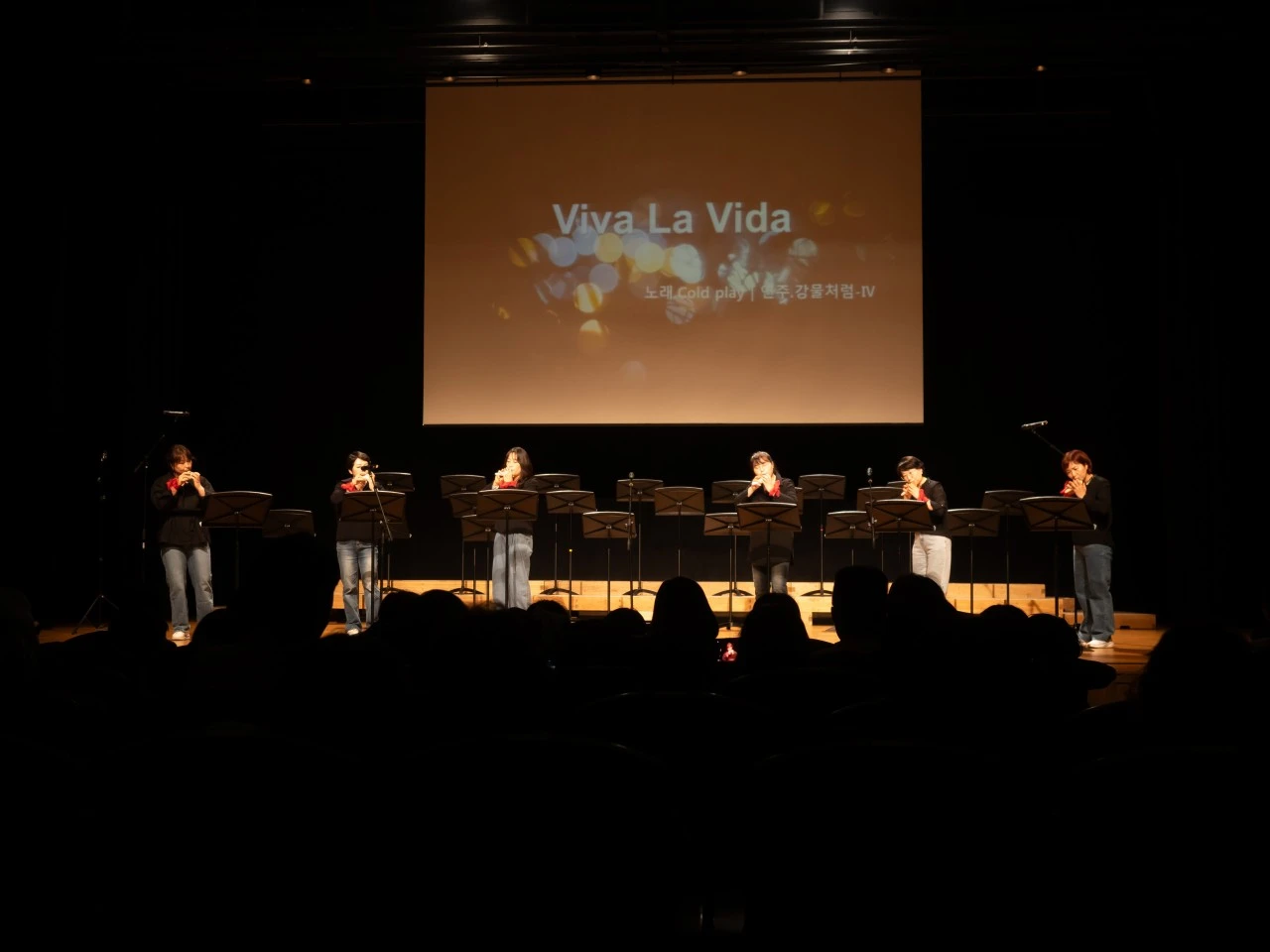 연주회를 다시 떠올려 보자면, 공연의 시작을 알리는 종소리와 함께 베이스 독도리나의 묵직한 울림으로 시작된 첫 연주곡, '아침이슬'에 이어 김준모 오카리니스트의 '아름다운 사람', '인생아 고마웠다'의 맑은 음률에 우선 귀가 정화되었다. 50명이 넘는 강물처럼 단원 모두가 소리를 모은 '오늘이 좋다', '고향의 봄', '황진이', 'Viva La Vida', '아름다운 강산', '내가' 등의 연주에선 진정 함께하는 정성의 소리가 무엇인지 느낄 수 있었다. 김준모 연주자(한국식 오카리나 협회 대표이자 오카리니스트)와 신경화 연주자(초등교사이자 <강물처럼> 앙상블 단장)의 듀엣 연주곡, 'Tom Boy'의 깊고 조화로운 소리에 마음을 뺏길 때쯤, 질풍처럼 쏟아지는 신경화 연주자의 솔로 연주곡, '질풍가도'에선 객석 모두가 떼창으로 하나가 되었다.