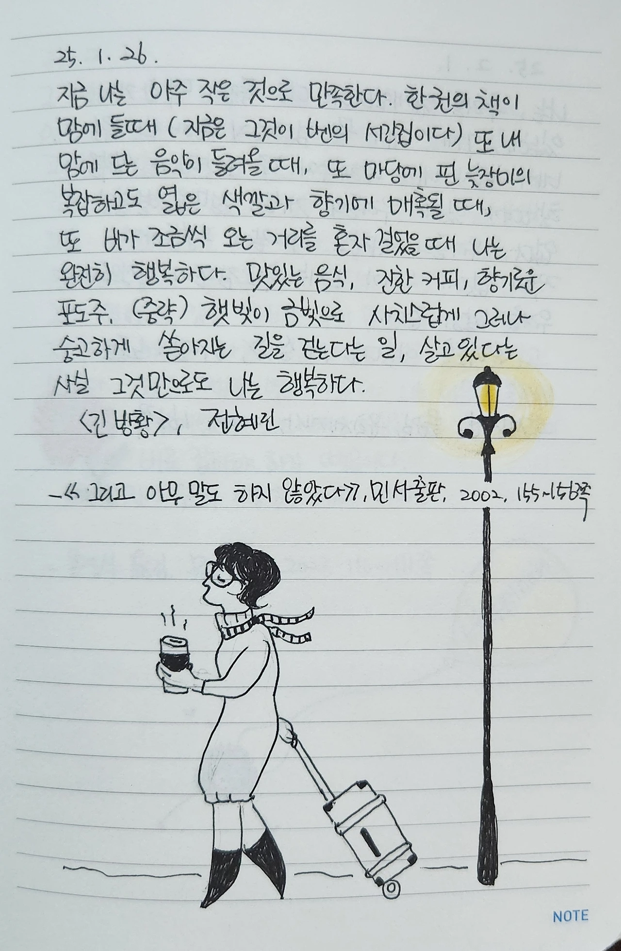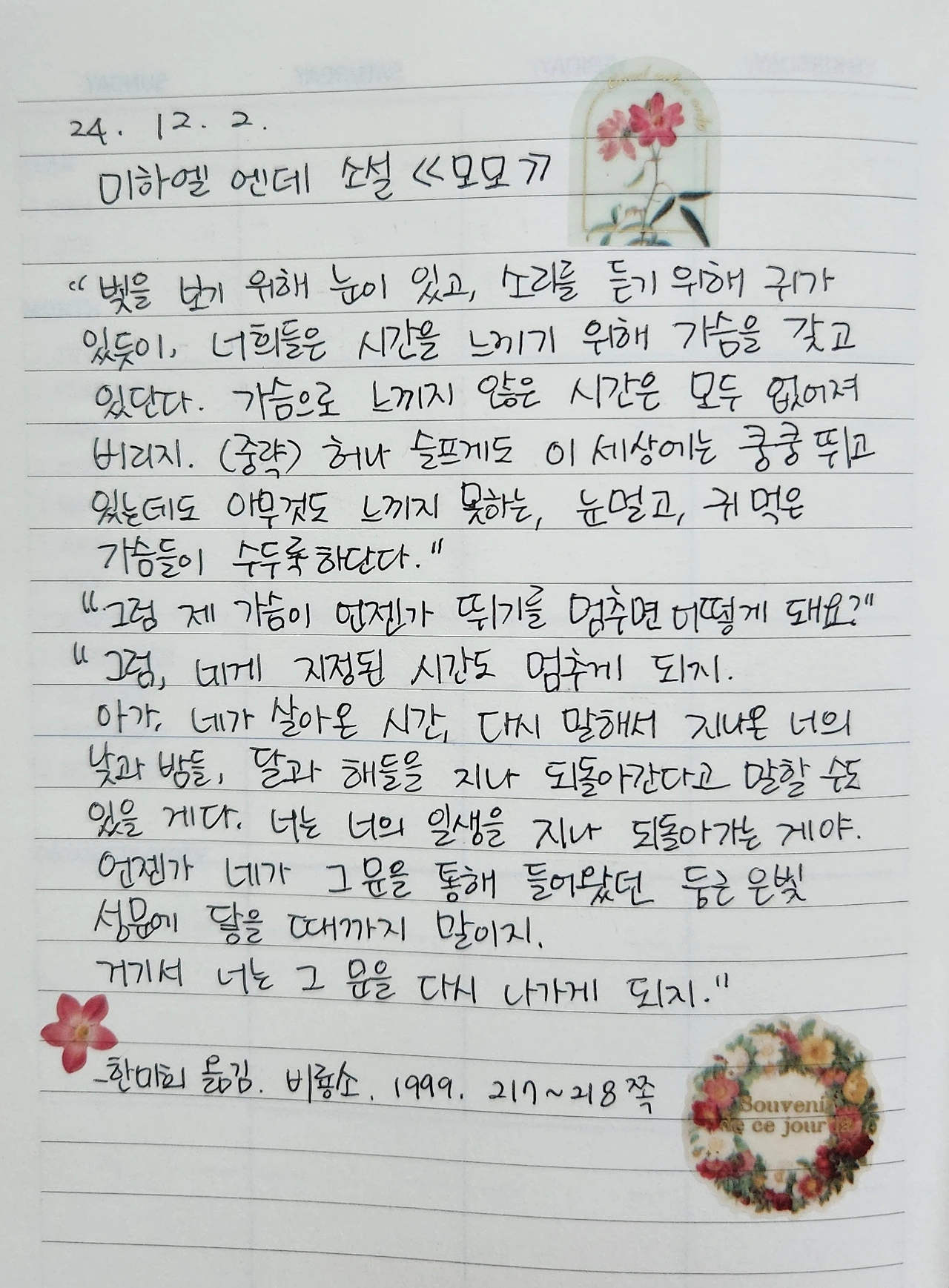 개인적으로, 문장들이 너무 마음에 들어 한 번 더 쓰고 싶은 마음에 책에 직접 쓰지 않고 필사 노트를 따로 마련해 썼었다. 마음에 드는 것을 만나면 왠지 아껴 쓰고 싶은 마음 있지 않은가. 필사 책 문장을 보고 다른 필사 노트에 옮겨 쓴 뒤, 스티커로 꾸미거나 간단한 그림을 그려 넣는다면 나만의 필사 노트를 꾸며가는 재미가 배가 된다.