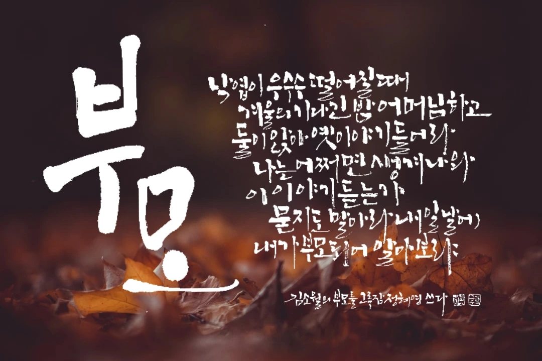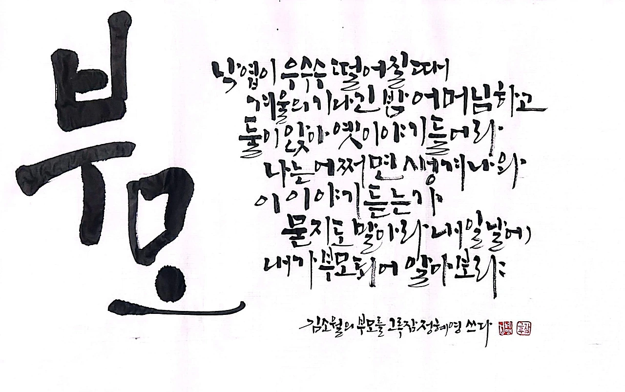 전 이 시 중 딸에게 가장 해주고 싶은 문장들을 붓으로 써서 아이의 방에 붙여 주었어요. 잠시 바람 쐬러 나갔다 돌아온 딸이 보더니 정말 함박꽃처럼 활짝 웃으며 좋아해요. 그게 그렇게 저릿하더라고요. 어딘가에서 본 것 같다는 아이 말에 웃음이 나왔죠. 작년 수능 필적 문구였다는 걸 알았다면 잠시 눈빛이 흔들렸겠지요?