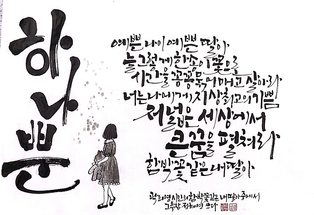 캘리를 쓰는 엄마라 뭐라도 딸에게 도움이 되는 글귀를 써주려고 찾다 보니, "저 넓은 세상에서 큰 꿈을 펼쳐라"라는 글귀가 눈에 들어왔어요. 곽의영 시인의 '하나뿐인 예쁜 딸아'라는 시의 한 문장이었어요. 시를 읽어 보니, 어쩜 자식 가진 부모 마음은 이리 똑같을 수가 있을까요. 다음은 '하나뿐인 예쁜 딸아'의 전문이에요.
