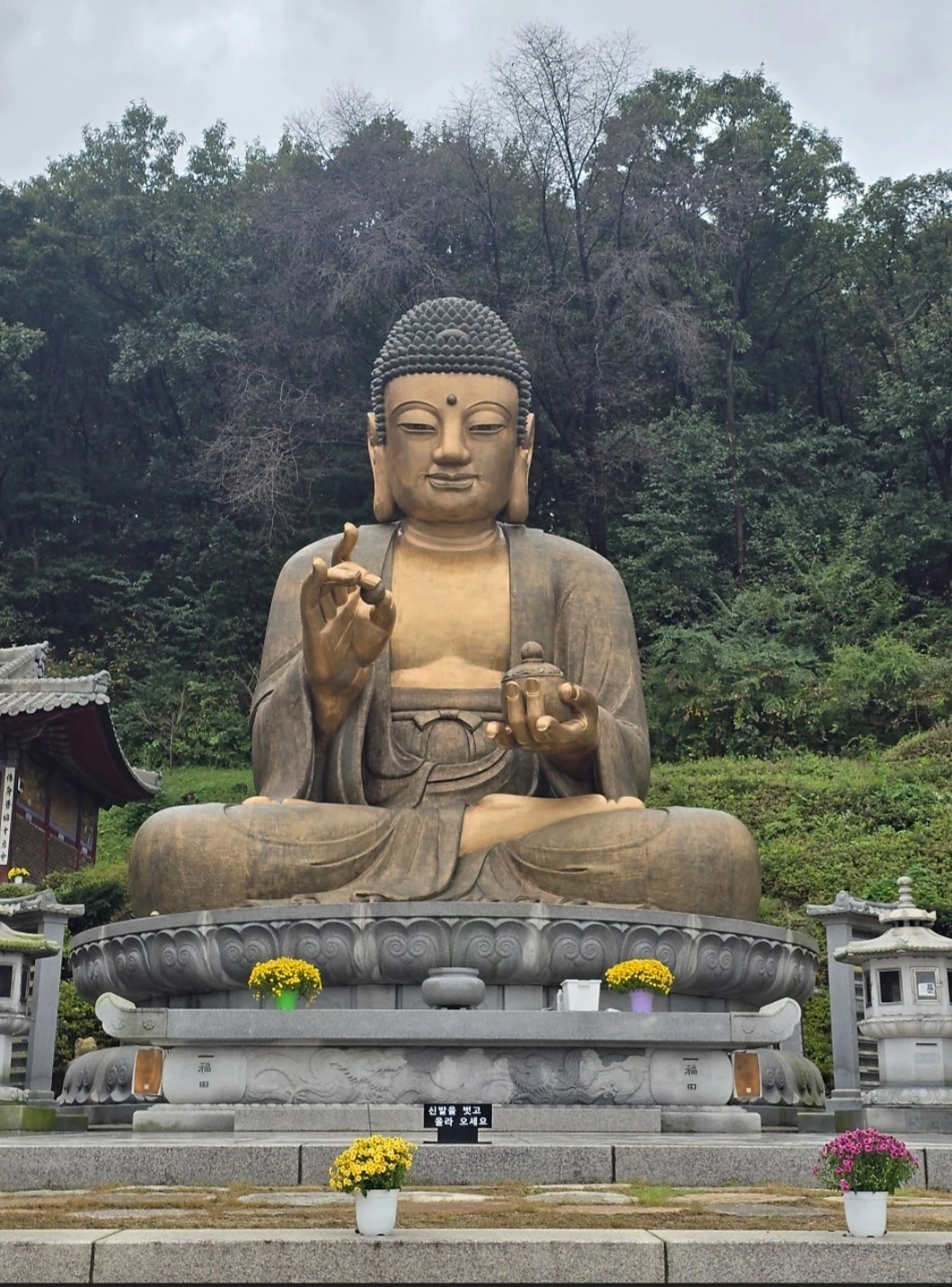 토요일에 남편과 보문사에 가기로 결정한 후, 그 이전에 먼저 108배 체험을 해봐야겠다는 생각이 들었어요. 그렇게 지난 목요일, 집에서 멀지 않은 파주 약천사에 먼저 다녀왔어요. 작년에 아들 입시를 무사히 마친 지인이 추천해 준 곳이라 믿음이 갔거든요. 절 입구에 들어서면 한눈에 보이는 거대한 황금빛 불상, 남북통일 약사여래불을 보며 약천사가 유명한 이유가 단번에 이해되었죠.