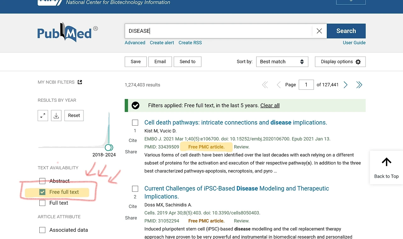 물론, 여기서도 유료 논문이 있고, 건 별로 돈을 지불해야만 볼 수 있다. 이런 경우, 학생이라면 학교 도서관 계정으로 로그인해서 제휴된 저널은 무료로 볼 수 있다. 배경지식을 위해 무료 논문만 찾는다면 ‘Free full text’ 항목에 체크하여 검색할수 있다.