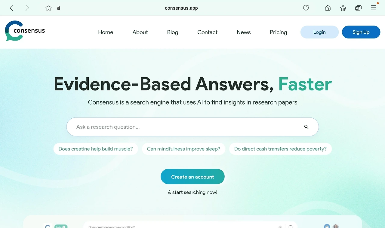 나의 최애 사이트는 [Consensus]라는 곳인데 직관적인 구성이 마음에 들어서다. 검색창에 연구 질문을 남기면 이와 관련된 논문들을 뽑아준다.