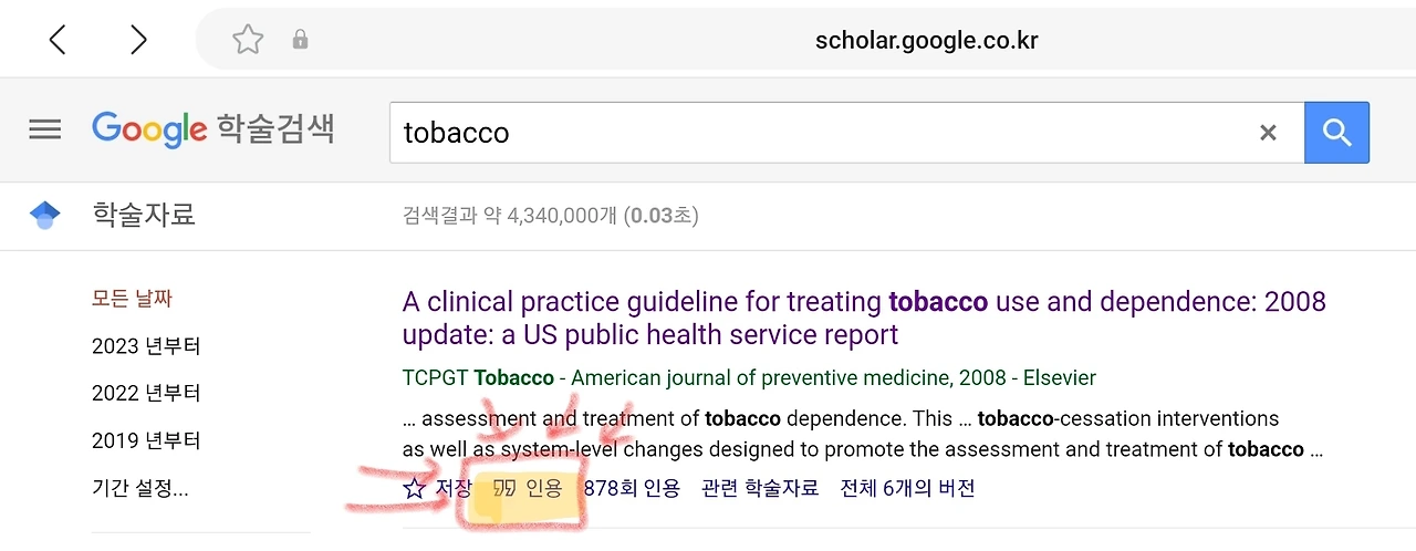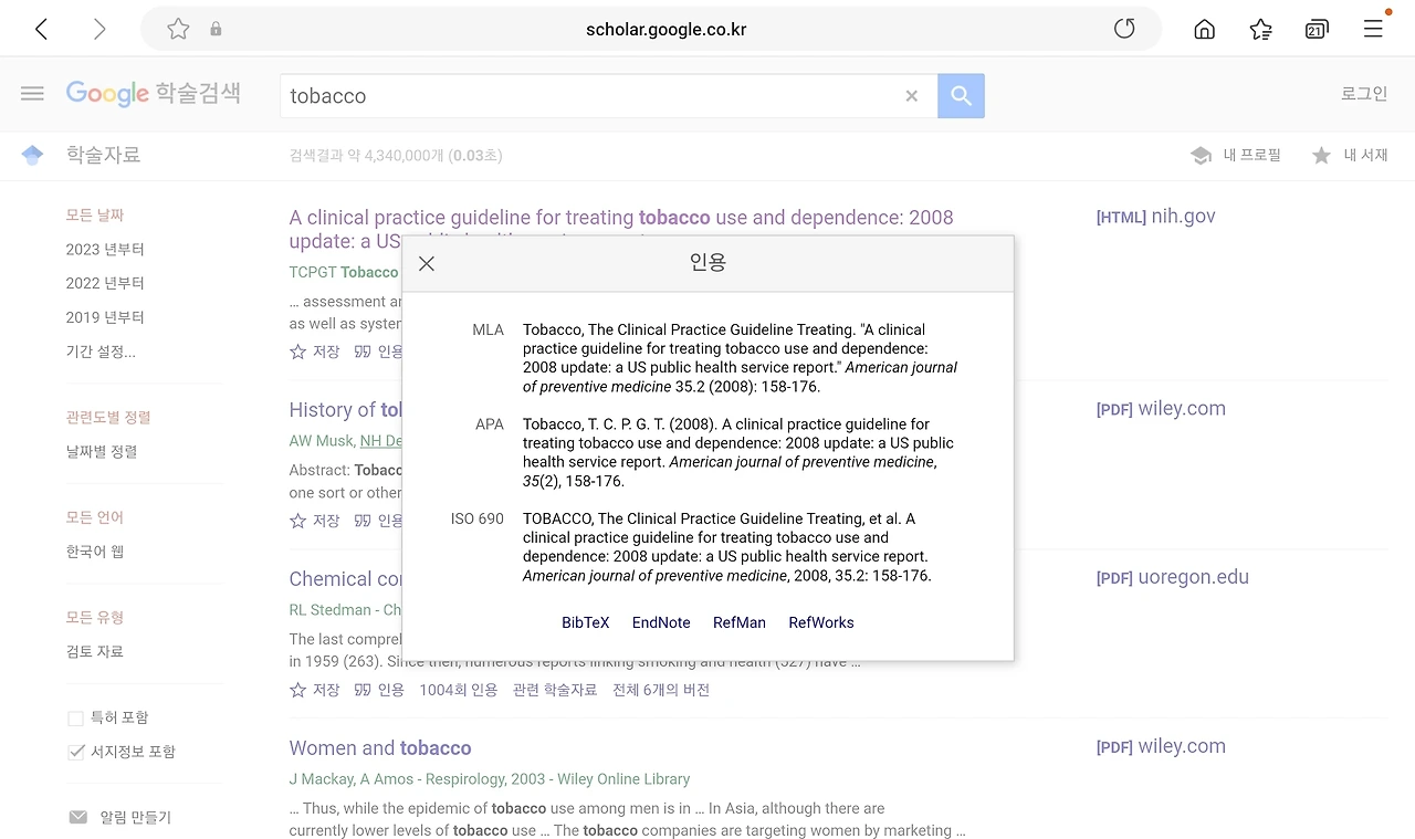 구글스칼라에서 큰 따옴표와 ‘인용’이라고 써 있는 건 ‘서지정보’로 흔히 말하는 참고문헌에 해당하는 정보를 준다. 양식은 각 학술지 혹은 학교에서 만들어 놓은 양식에 따라 다르게 표기한다.