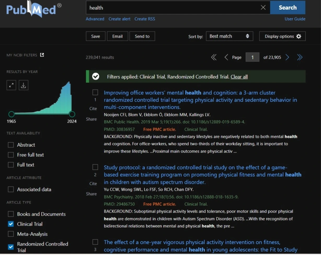 보건의료 관련 전세계 논문을 연결시켜주는 검색엔진이다. 의약학 논문판 구글이라 봐도 된다. 내가 검색하고픈 키워드만 입력해도 되고, 정확한 논문 이름이나 저자명을 입력해도 찾을 수 있다. 검색을 하면 연도별, 학술지 분야별, 연구방법별 등으로 세부검색도 가능하다.