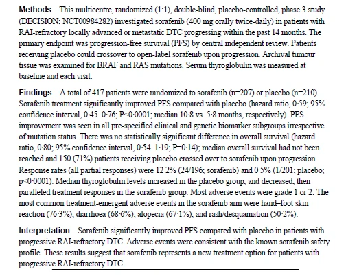 소라페닙이 진행 중인 RAI 저항성 DTC 환자를 위한 새로운 치료 옵션으로 PFS를 유의하게 향상할 수 있음을 시사합니다.