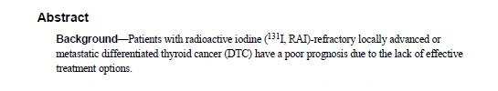 → 131I, RAI가 정확히 뭔지는 모르겠지만, 저 숫자코드에 내성을 갖고 있는 갑상선암이면 예후가 안 좋구나. 치료할 수 있는 방법이 많이 없어서 안 좋다고 하네? 예후를 좋게 할 수 있는 방법이 필요한 것 같아.