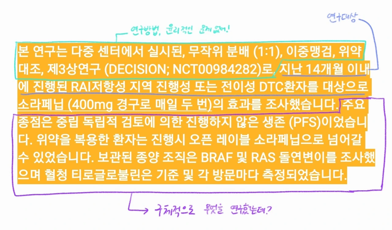 → 그래서 우리가 만든 '소라페닙'이라는 약이 효과가 있는지 시험해 봤어. 모든 건 윤리적으로 문제가 없이 허가받았고, 연구방법은 ~~(위의 내용) 이렇게 했어.