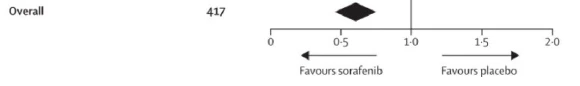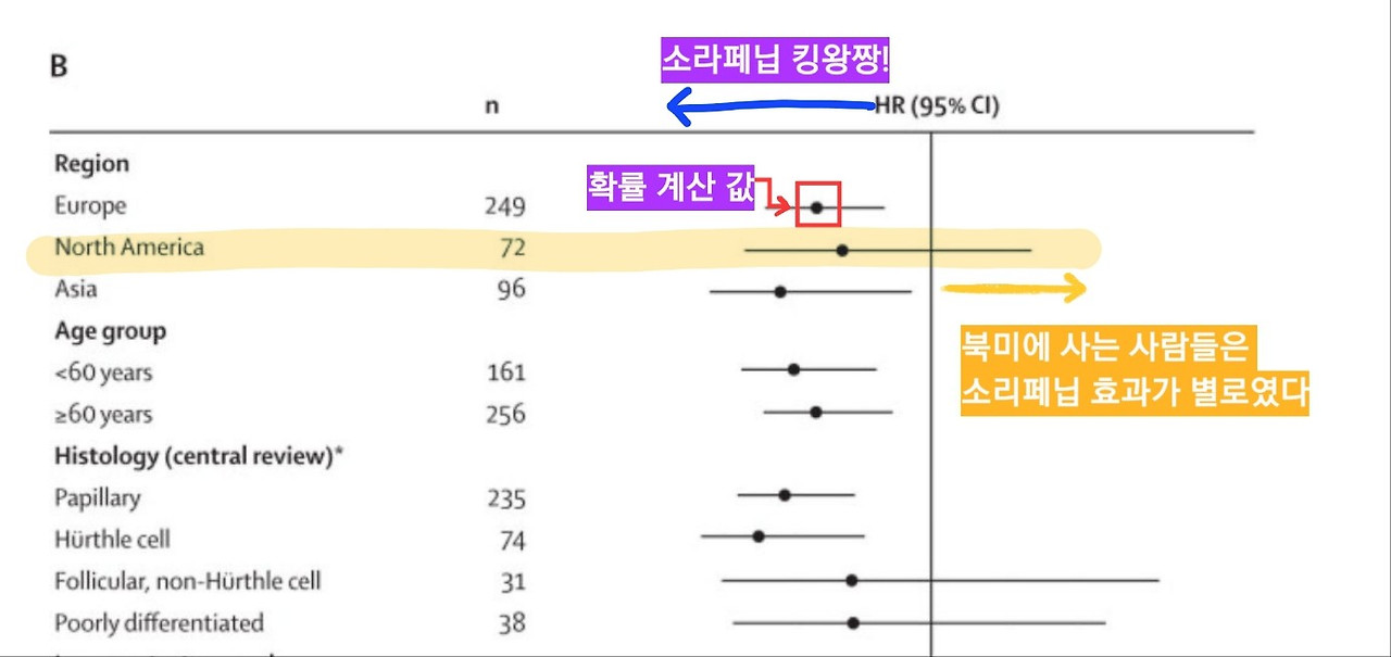 그림에서 보면, B그림은 왼쪽으로 갈수록; 소라페닙을 쓸수록 ‘안 좋은 예후가 발생할 확률=HR’이 적었다는 이야기고(=소라페닙 킹왕짱),오른쪽으로 갈수록; 소라페닙이 별로였다는 뜻이다..