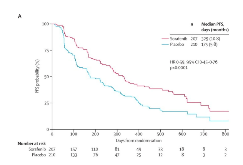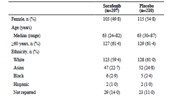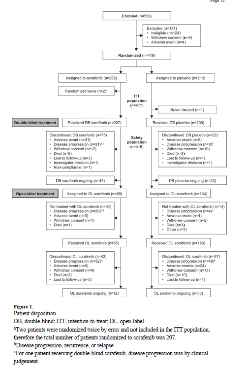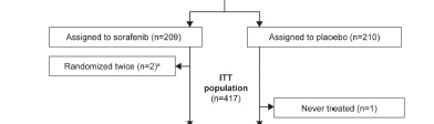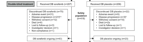 한 그룹은 소라페닙을 투여했고 (209명), 나머지 한 그룹은 가짜약을 투여하였다 (210명)