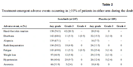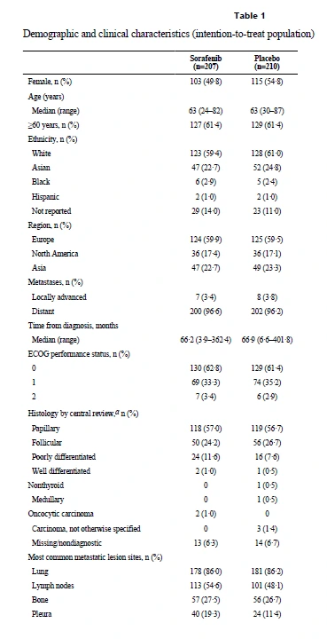 → 자, 보자. 소라페닙이 약 이름이니까 실험약을 먹은 그룹이네. Placebo는 가짜약을 먹은 그룹이네. 여자만 써놨네? 성별은 보통 남/녀 두 개로 나누니까 여자만 써 놔도 남자가 몇 명인지 알 테니까 그렀구먼.