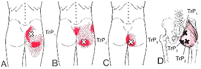 엉덩이 근육 세 가지의 증상을 토대로 나눈다면, 오래 앉아 있거나 푹신한 곳에 누울 때 엉치뼈 주위가 아프다면 바로 위 사진의 'X' 부분을 풀면 좋다. 오래 서 있거나 걸었을 때 허리가 아프다면 이 글의 맨 위에 있는 첫 번째 사진 중 왼쪽 세가지 사진의 'X'부분을 풀면 좋다. 고관절 및 다리 뒤, 바깥쪽으로 당기는 통증을 느낀다면 맨 위에 있는 사진 중 오른쪽 두 사진의 'X'부분을 풀면 좋다.
