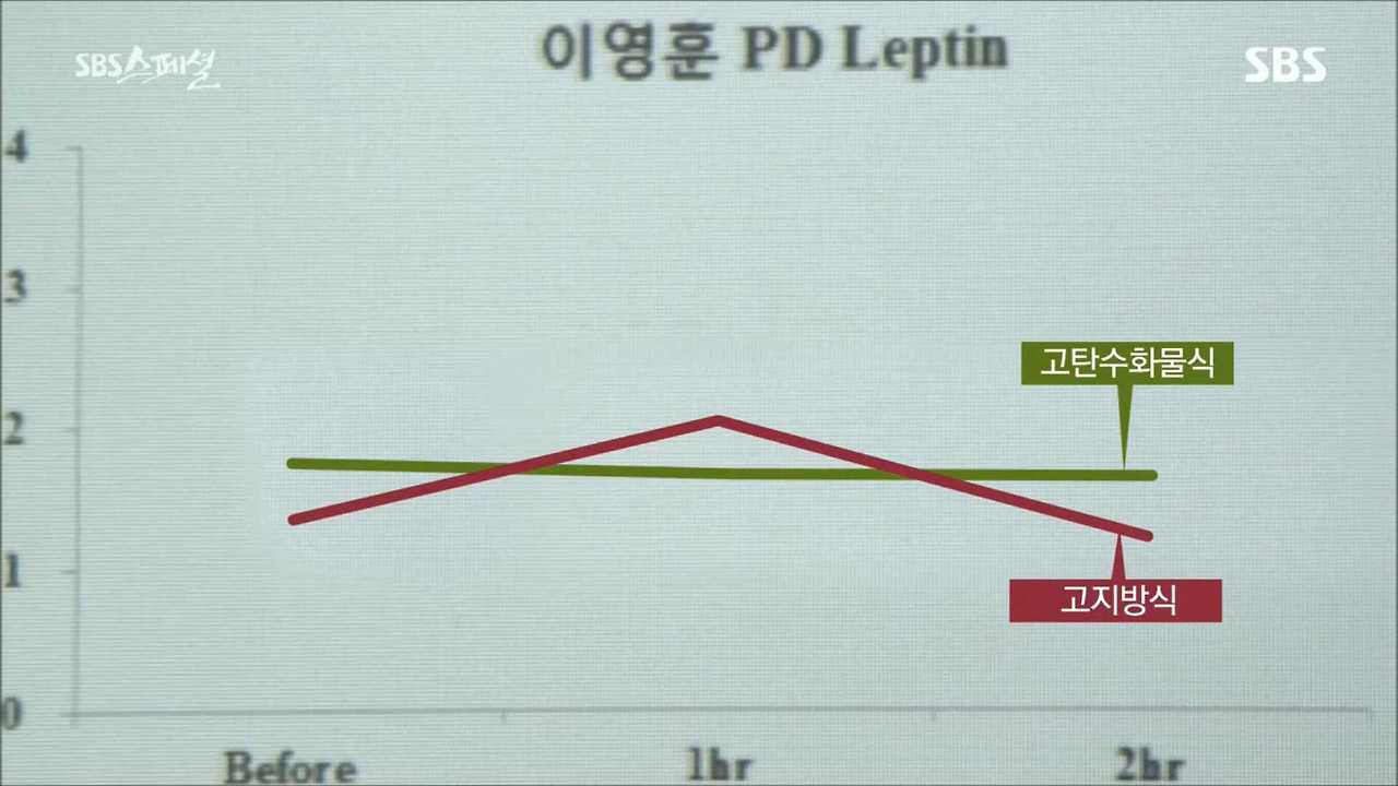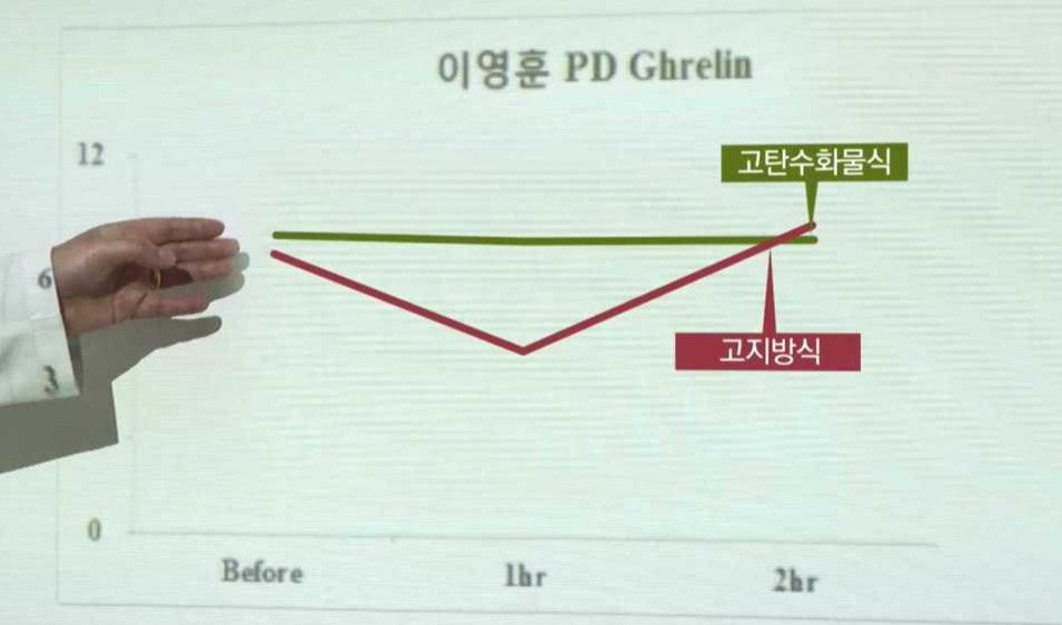 여기서 두 식단의 아주! 중요한 차이점이 있다. 바로 호르몬의 작용! 설명에 앞서 간단히 그렐린/렙틴 호르몬의 개념을 잡고 가자. 그렐린 호르몬은 '식욕 자극'호르몬으로 혈당이 떨어지고 공복감이 길어지면 분비되는 호르몬이고, 렙틴 호르몬은 '식욕억제'호르몬으로 혈당이 올라가고 포만감이 들면 분비되는 호르몬이다. PD의 고지방 식단에서는 그렐린/렙틴 호르몬의 정상 작용이 일어났으나 고탄수화물 식사에서는 호르몬의 변화가 거의 없었다. 즉, 양질의 고지방식단에서는 몸이 포만감을 느꼈지만, 양질의 고탄수화물 식단에서는 느끼지 못한 것이다. 포만감을 느끼지 못하는 식단을 지속하게 되면 우리 몸은 음식을 먹어도 먹어도 더 먹으라고 요구할 것이다. 양질의 고탄수/고지방 식단. 두 식단 모두 체중감량에 성공했지만 호르몬의 작용에서 차이가 뚜렷했다. 호르몬이 제대로 작용하는 고지방식단이야말로 PD에게 알맞은 다이어트에 식단인 것을 알 수 있었다.