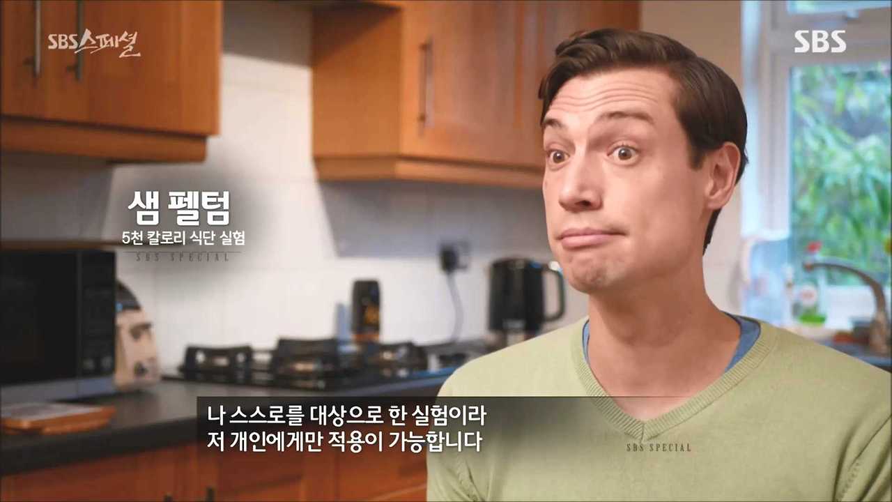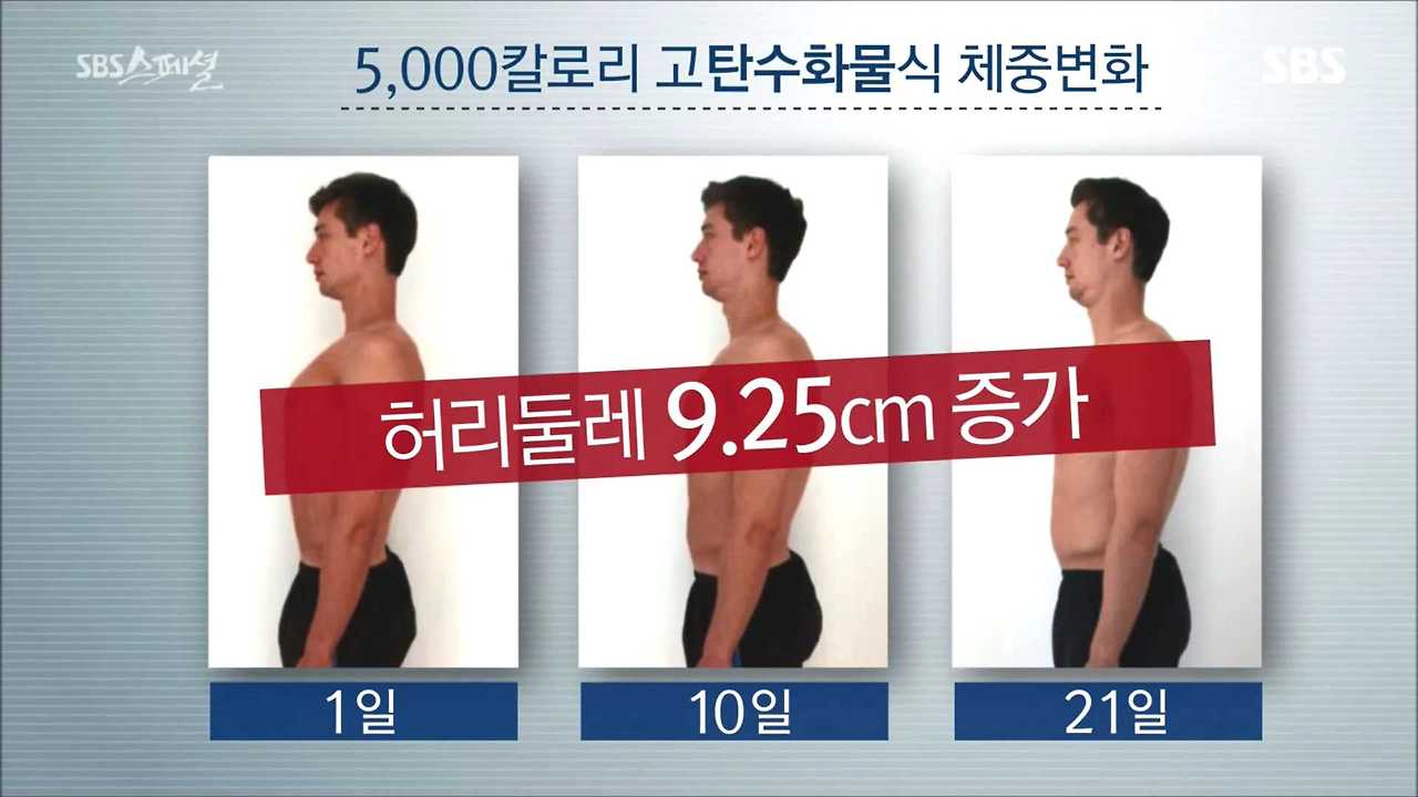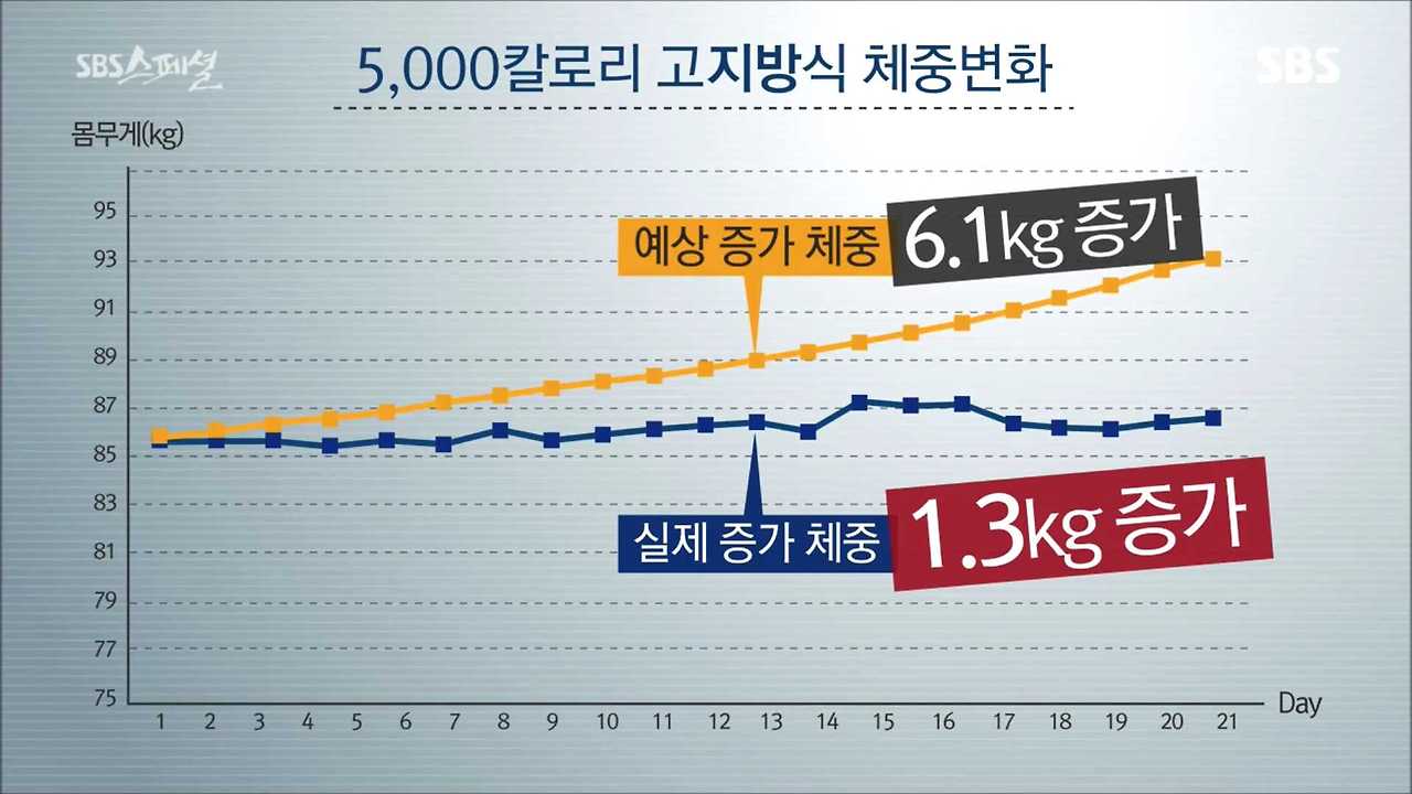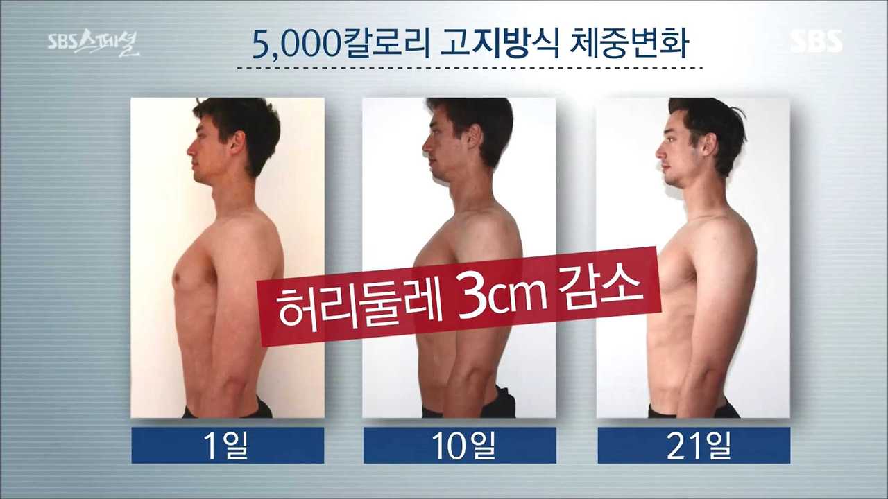 오차범위가 큰 애트워터의 칼로리 계산법이 무의미하다면 무엇을 기준으로 삼아야 할까? 아쉽게도 아직까진 대안이 없다. 대신 이번 다큐에서는 칼로리의 '양'이 아닌 '질'이 중요하다는 실험을 보여준다. 위 사진의 주인공인 쌤은 3주간 5,000칼로리의 고지방식사를 했다. 결과는 예상과 달랐다. 칼로리 공식대로라면 6kg의 늘어나야하지만 1.3kg만 늘어난 것이다. 더욱 놀라운 것은 허리둘레가 3cm 감소되었다는 것! 위 실험에서도 칼로리 계산이 우리의 몸에 맞지 않는 것을 보여주었다.