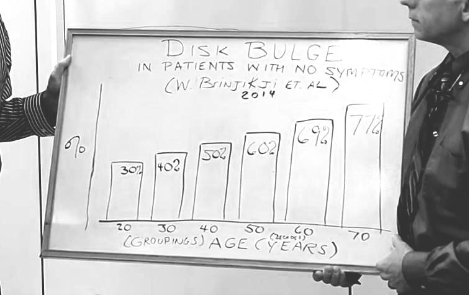 <20대의 30%, 30대의 40%, 40대의 50%, 50대의 60%, 70대의 77%, 80대의 84%.> 이 수치가 의미하는 것은 허리디스크 진단을 받았지만 아무런 통증이 없는 연령별 수치다. 어떻게 허리디스크(추간판탈출증)인데 아프지 않을 수 있단 말인가! 이 수치가 말하고 있는 것은 바로 구조적인(디스크)문제와 통증의 관계가 상당히 적다는 것이다. 디스크뿐만 아니라 ‘퇴행성척추증’은 진단을 받아도 통증이 없는 사람의 수가 디스크보다도 높다. 위 수치의 출처인 논문은 퇴행성척추증(구조적 문제)은 정상적인 노화의 일부이며 통증과 관계없다고 결론짓는다.