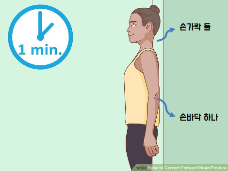 바른 자세를 연습하기 위한 가장 쉬운 방법이 있다. 벽에 머리, 등, 엉덩이, 발 뒤꿈치를 대고 선다. 목 뒤에는 손가락 둘, 허리 뒤에는 손바닥 하나가 꽉 끼게 만들면 끝이다. 방법은 쉽지만 실제로 해보면 자세를 잡기 꽤 어려울 것이다. 대부분 등이 굽어 복근이 약해서 목과 허리 뒤의 공간이 커지기 때문이다. 키가 커진다는 느낌으로 가슴을 펴고, 허리가 과하게 꺾이지 않게 아랫배에 힘을 주려고 노력해야 위에 설명한 자세를 만들 수 있을 것이다. 자세를 만든 뒤엔 1-2분 정도 서 있으면 좋다. '이 자세가 올바른 자세야!'하고 질 좋은 감각정보를 뇌에 입력시켜준다면 평소에도 바른 자세를 잡기 수월해질 것이다.