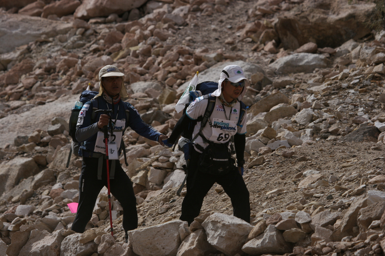 추위와 허기로 에너지는 모두 소진됐지만 두 다리는 주로를 찾아 흙탕물을 허우적거렸다. 엎친데 겹친 격으로 후미에 처진 일본 여자선수 미애 Minezawa Mie까지 챙겨야 했다. 천신만고 끝에 CP4에 도착해 의식을 잃어가는 미에를 의료진에게 인계했다. 밤 10시 40분, 지친 몸을 이끌고 36km를 달려 도착한 캠프는 적막했다. 아타카마에서 호된 신고식을 치렀다. 진흙과 소금 덩어리로 범벅이 된 신발을 털다 쓰러져 잠이 들었다. 오늘 온전히 내 어깨에 기댄 두 영혼이 있었지만 길라잡이인 나의 공포와 두려움이 그들보다 덜하진 않았다.