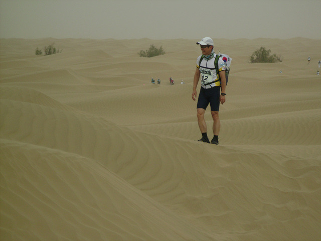 저녁 6시, 원주민들의 요란한 북소리가 울려 퍼지자 움츠렸던 선수들이 연이어 모래폭풍 속으로 뛰어들었다. 경기 전부터 불어대는 광풍이 바닥의 모래를 훑어 올리며 거세게 회오리쳤다. 뿌연 흙먼지에 갇혀 사방을 분간할 수 없었다. 선수들은 주로를 이탈하지 않기 위해 산짐승처럼 눈을 번득이며 두리번거렸다. 1천2백여 년 전 신라 고승 혜초는 불법 佛法 찾아 죽음의 바다 Sea of Death 타클라마칸 사막을 건넜다. 그때 불어댄 모래바람도 지금 보다 덜하지 않았을 것이다.