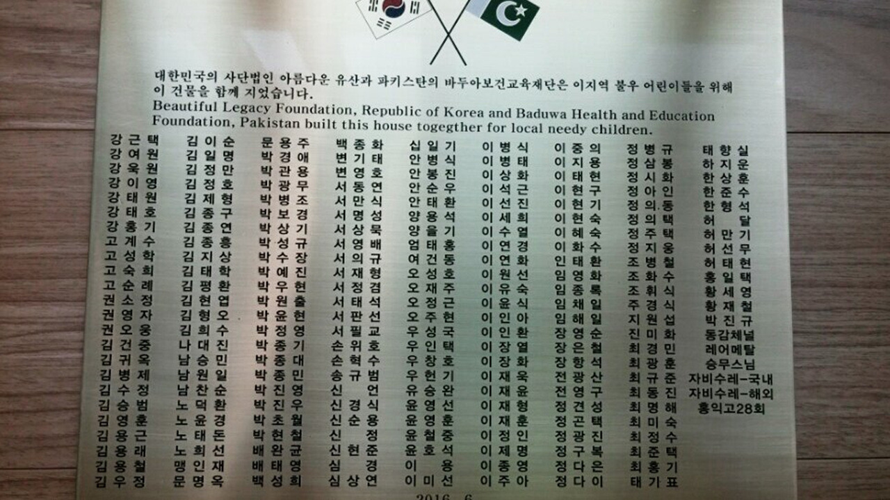 도착한 인천공항에서 핸드폰 전원을 켜자 진동과 함께 그간 쌓인 메시지가 쏟아졌다. 반가운 소식도 많았다. 고아원 건립기금이 무려 5,774,000원이 모였다는 문자도 있었다. 10m에 1원, 1구좌에 16,000원. 160km의 오지를 달리면서 발톱이 죽고, 발바닥 물집이 커질수록 건립기금이 쌓인 것이다. 설렁탕 2그릇 혹은 탕수육 한 접시 가격의 1구좌 16,000원. 각박한 현실에서 적지 않은 분들의 관심과 사랑이 기적을 만들어냈다. 그리고 6월 말, 우헌기 이사장은 기부금 전액과 모든 기부자들의 이름이 새겨진 동판을 챙겨 들고 파키스탄 오지로 들어갔다.