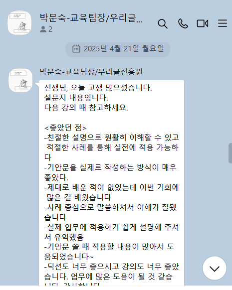 4월에도 시·도의 경계를 넘나들며 후배들과 마주했다. 4/3(목) 울산광역시동구청(2H), 4/8(화) KIRD 국가과학기술인력개발원(3H), 4/9(수) 한국건강가정진흥원(3H), 4/10(목) 세종인재평생교육원(2H), 4/11(금) 우리글진흥원(2H), 4/14(월) 강원도공무원교육원(7H), 4/21(월) 우리글진흥원(2H), 4/30(수) 한국식품안전관리원(2H)에서 공무원 대상 공문서 보고서 작성법 강의를 진행했다.