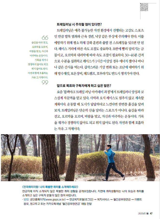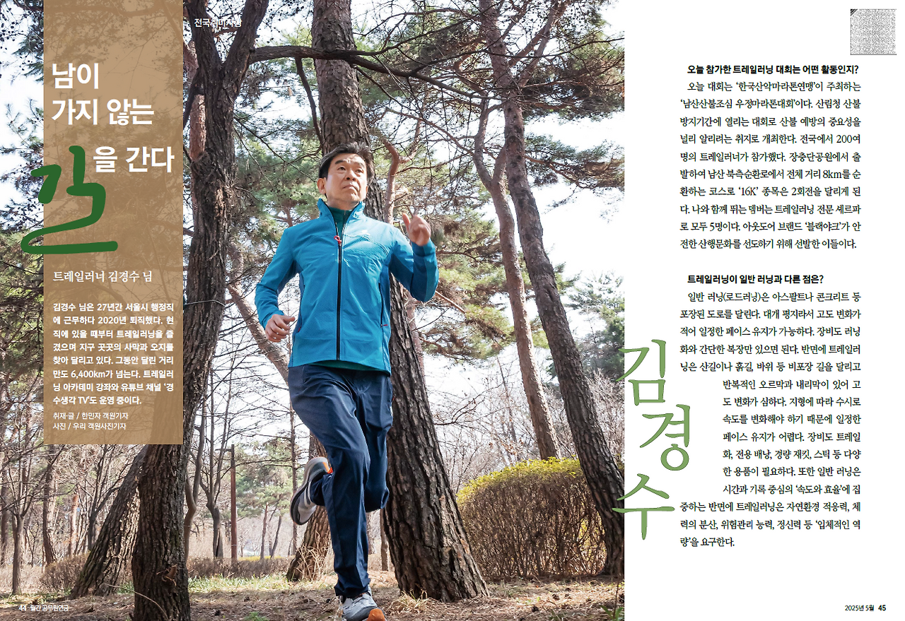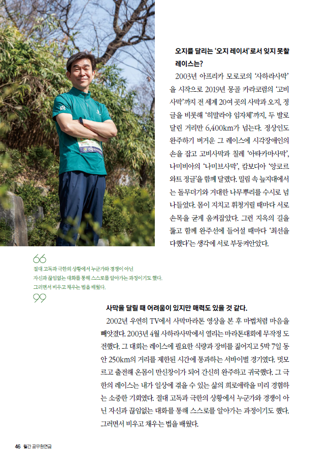 공무원연금 5월호에 인터뷰 기사가 게재됐다. 인터뷰는 몇 주 전 서울 남산 동쪽 기슭~ 장충단공원에서 있었다. 주제는 사막 마라토너, 트레일 러너로서의 특별한 삶 소개. 2003년 사하라사막(243km)을 시작으로 2019년 몽골 고비사막(250km)까지 두 발로 내디딘 거리만 20개국 6,400km에 달한다.