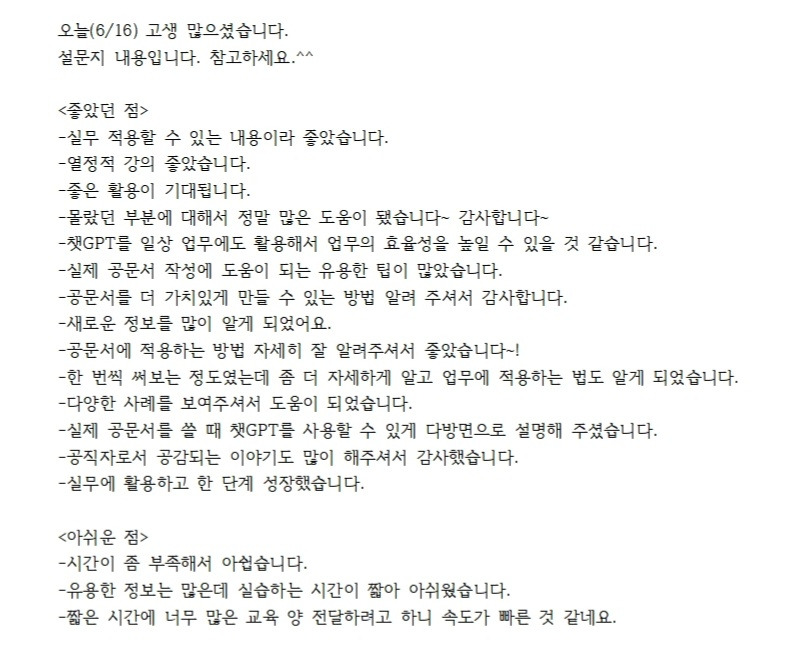 So... 6월에도 어김없이 이런 고충을 덜어드리기 위해 도의 경계를 넘나들며 공문서와 보고서 작성법 강의로 6/13(금) 강원도공무원교육원(7H), 6/23(월) 국방대직무교육원(3H), 6/24(화) 충남교육청교육연수원(6H), 6/25(수) 대전한밭도서관(2H)에서 공무원 후배님들을 마주했다. 6/20(금)에는 강원도공무원교육원 보고서 작성 실습&채점을 진행했다. 6/5(목) 우리글진흥원, 하루에 끝내는 챗GPT로 보고서 만들기(6H) 강의를, 6/16(월) 우리글진흥원, 챗GPT로 공문서 쓰기(3H)도 마쳤다.